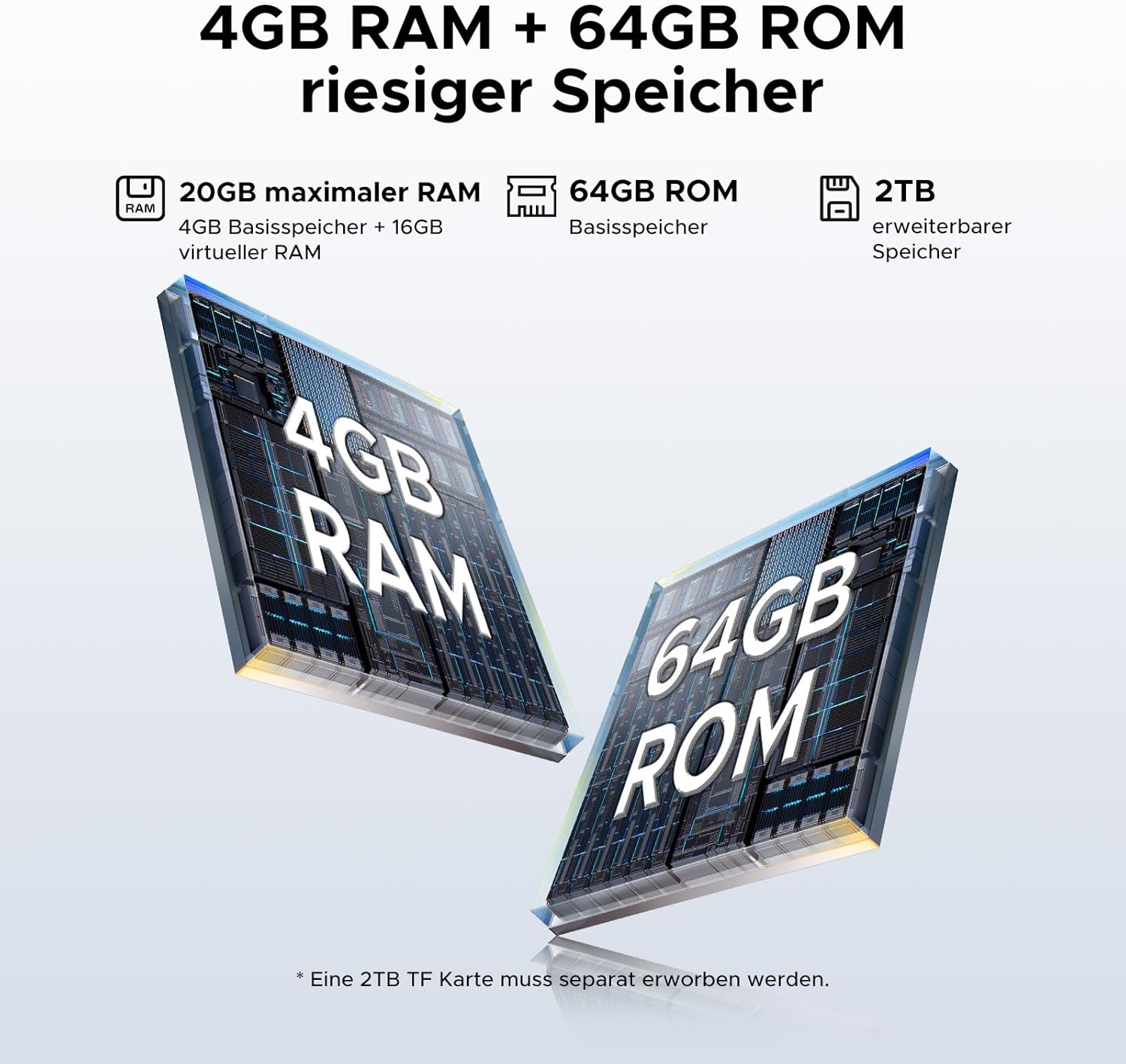 • 20 GB RAM + 64 GB ROM + 2 TB разширение: Таблетът DOOGEE TabA9+ с Android 15 е оборудван с 4 GB памет и поддържа 16 GB виртуална памет, както и LPDDR4X за плавна многозадачност. 64 GB пространство за съхранение ви позволява лесно да съхранявате снимки, видеоклипове, музика и приложения. Той също така поддържа разширение на паметта до 2 TB, така че можете да се наслаждавате на дигиталния свят, без да се притеснявате за липса на място за съхранение.