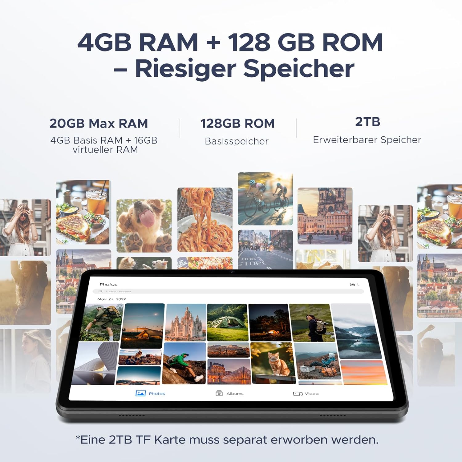 • 20GB RAM + 128GB ROM + 2TB TF карта: DOOGEE Tab A9 Pro 10-инчовият Android 15.0 таблет предлага 20GB RAM (4GB + 16GB виртуално разширяема RAM) за безпроблемна работа с таблета. С до 128GB място за съхранение можете да изтегляте различни приложения и игри. Капацитетът за съхранение може да бъде разширен до 2TB чрез TF карта, за да съхранявате всичките си любими снимки, видеоклипове и файлове.