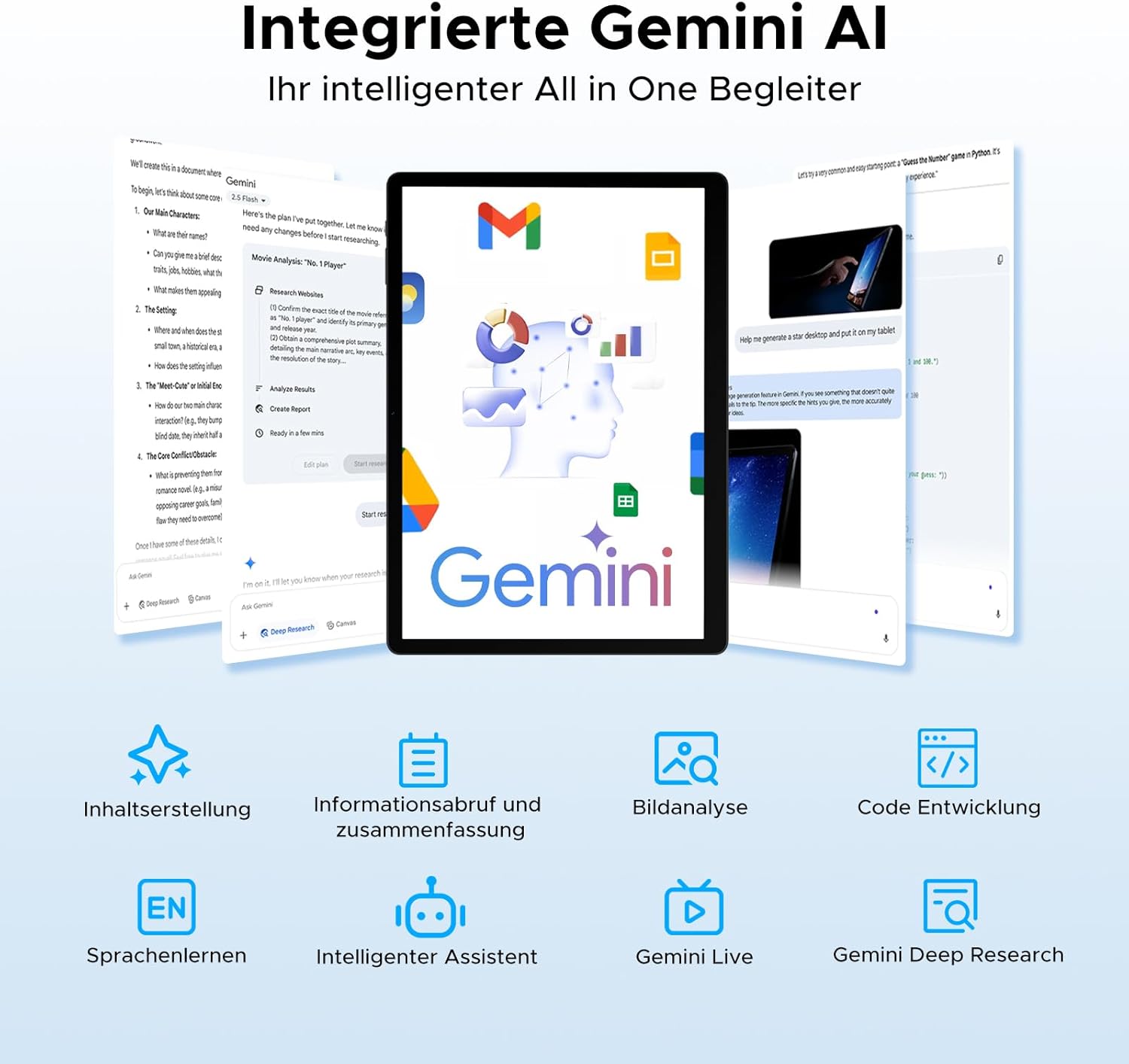 • 【14-инчов FHD+ екран + вграден Gemini AI】Таблетът Android 15 Tab E3 Max разполага с 14-инчов IPS екран с резолюция 2160*1440 и защита на очите. Екранът използва TDDI технология за интегриране на сензори за докосване в съществуващата LCD структура. Това го прави по-тънък, по-лек и по-чувствителен към допир. 14-инчовият таблет с вграден Gemini AI улеснява работата и живота ви. Можете също да използвате функцията Gemini Deep Research за сложни задачи, за да подобрите анализа и да получите по-задълбочени прозрения.