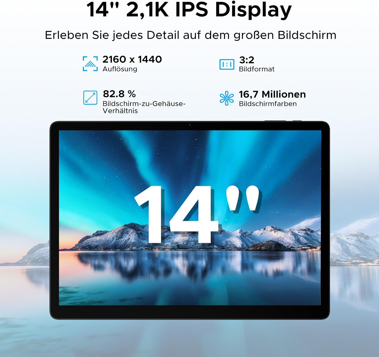 • 【Батерия 13500 mAh + висококачествени четири високоговорителя】14-инчовият таблет разполага с батерия 13500 mAh, което ви позволява да се наслаждавате на музика или филми денонощно, без да се притеснявате за зареждането. Четири стерео високоговорителя осигуряват по-ясен и по-силен звук, издигайки вашето развлекателно изживяване на ново ниво. Оборудван е с чип MediaTek Helio G100, който намалява генерирането на топлина, като същевременно поддържа отлична производителност и отлично качество на звука.