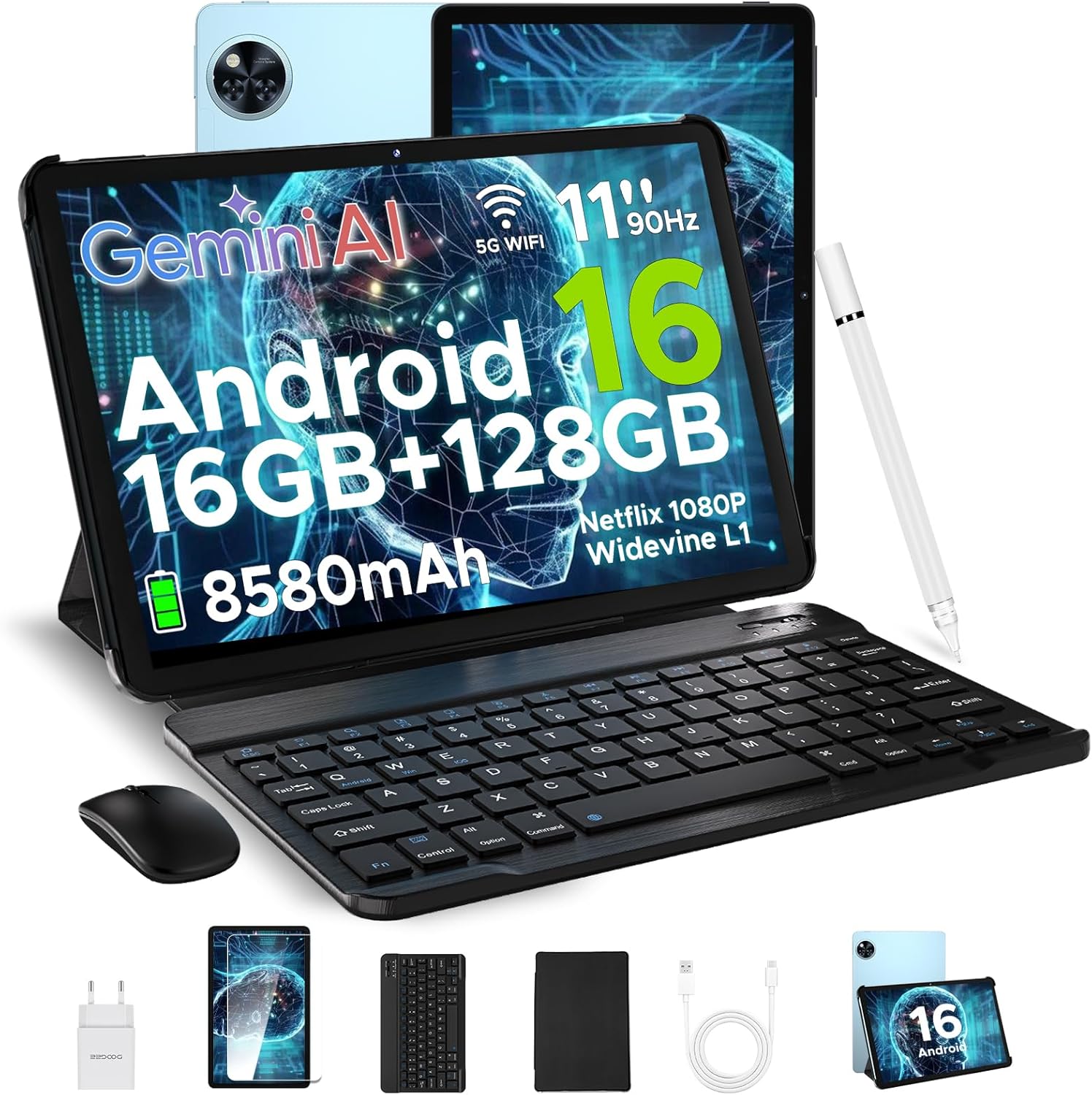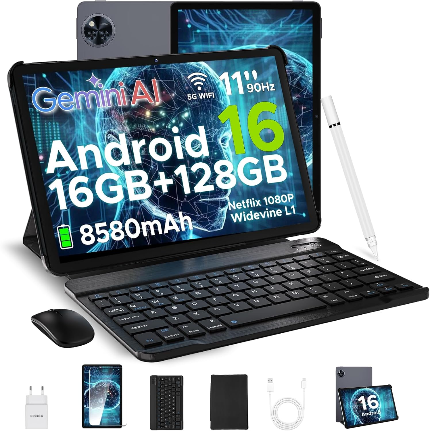 DOOGEE U11 Android 16 AI таблет 11 инча, 16GB + 128GB (2TB TF) геймърски таблети, T7200 Octa Core, 8580mAh, Gemini AI, WiFi 5, 90Hz дисплей, 13MP + 5MP, таблет с клавиатура, мишка, писалка, калъф и екран