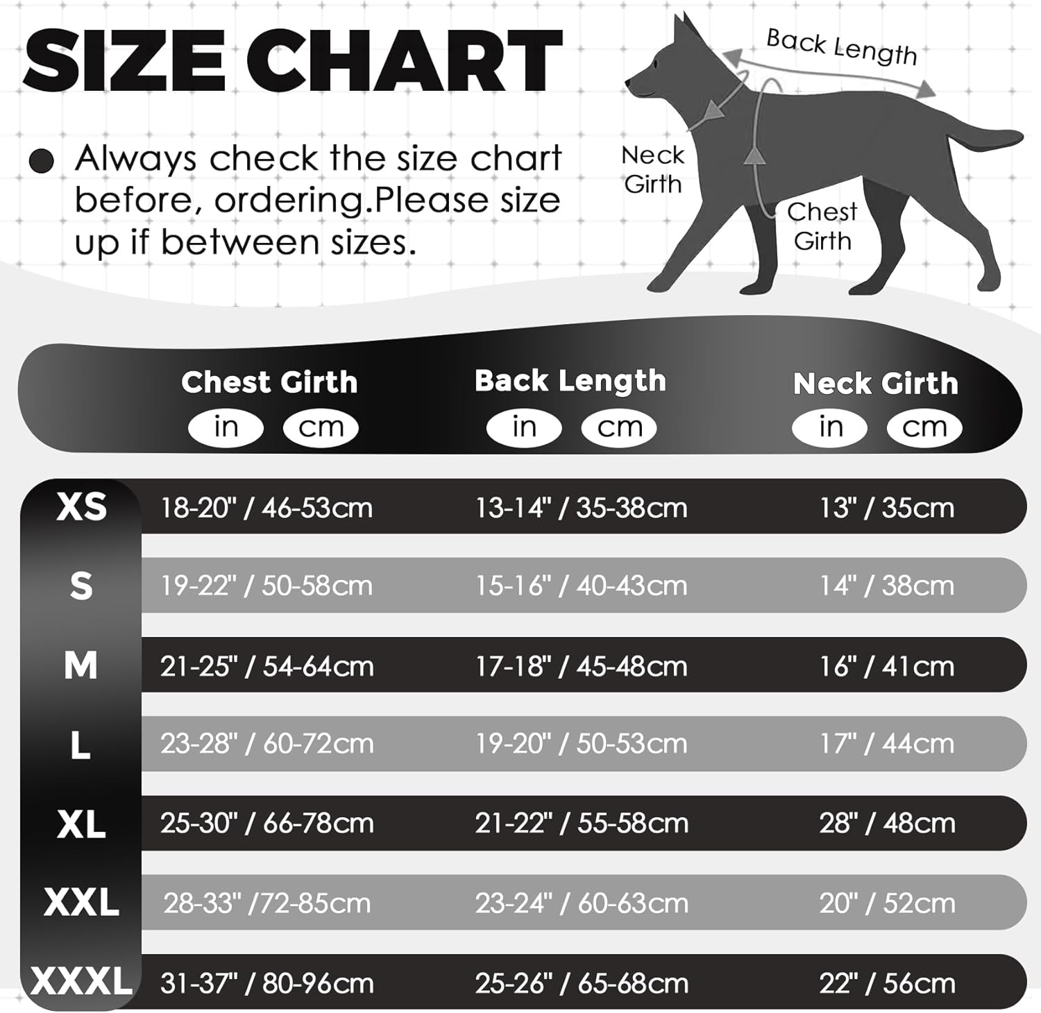 Създадохме таблица с размери с мерки, която е достъпна в информацията за нашата обява. По-долу ще намерите ръководство за размери и породи, но всяко куче е различно, така че това е общо ръководство!