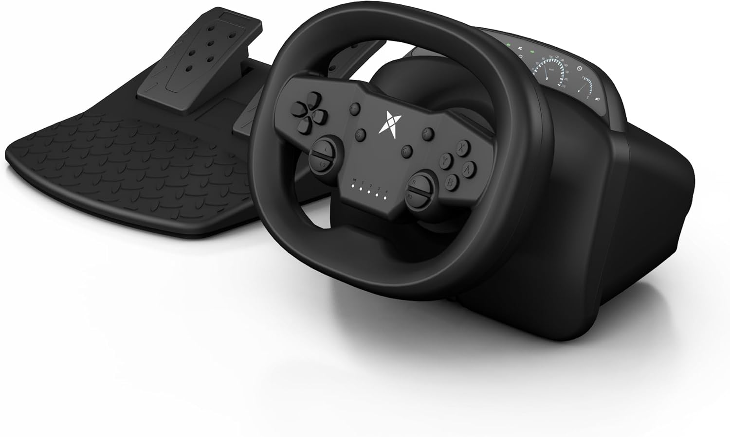 • ПРЕЦИЗЕН КОНТРОЛ С двойни вибрационни мотори и персонализируеми настройки за управление, можете да се насладите на точния контрол, от който се нуждаете в традиционните компютърни игри и състезателни симулации. Вградените педали осигуряват по-реалистична симулация на шофиране, за да подобрят вашето игрово изживяване.