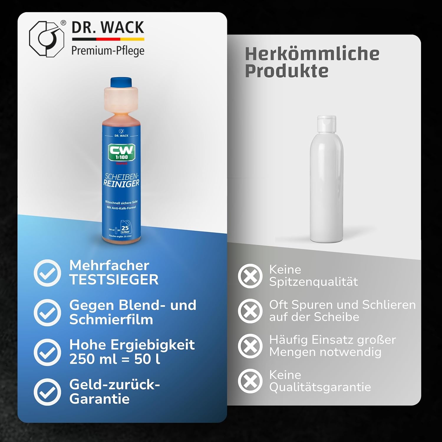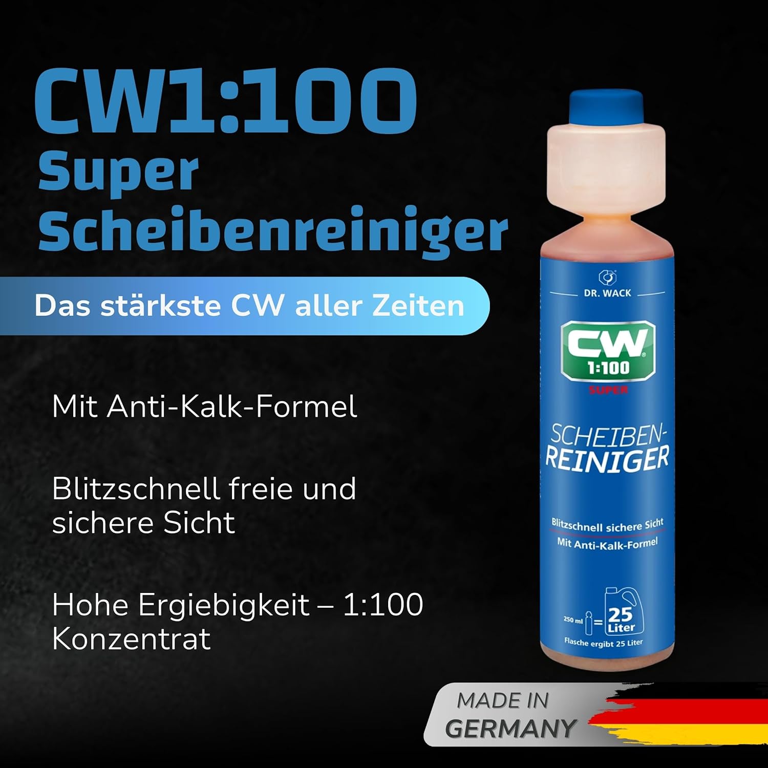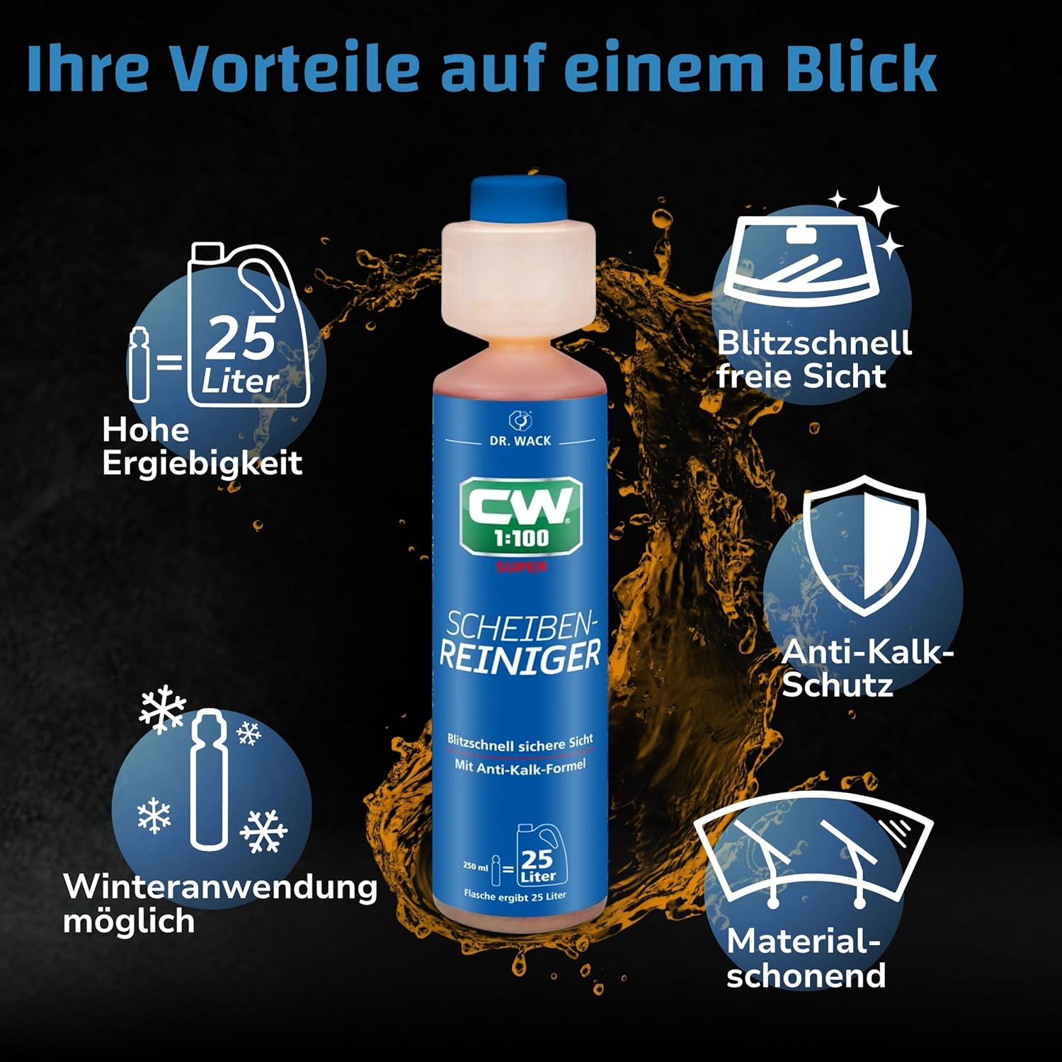 DR. WACK - CW1:100 Супер почистващ препарат за предно стъкло 250 мл - Концентрат с формула против котлен камък - Почистващ препарат за фарове и чистачки за предно стъкло - Висок капацитет за 25 л течност - Висококачествена грижа за автомобила