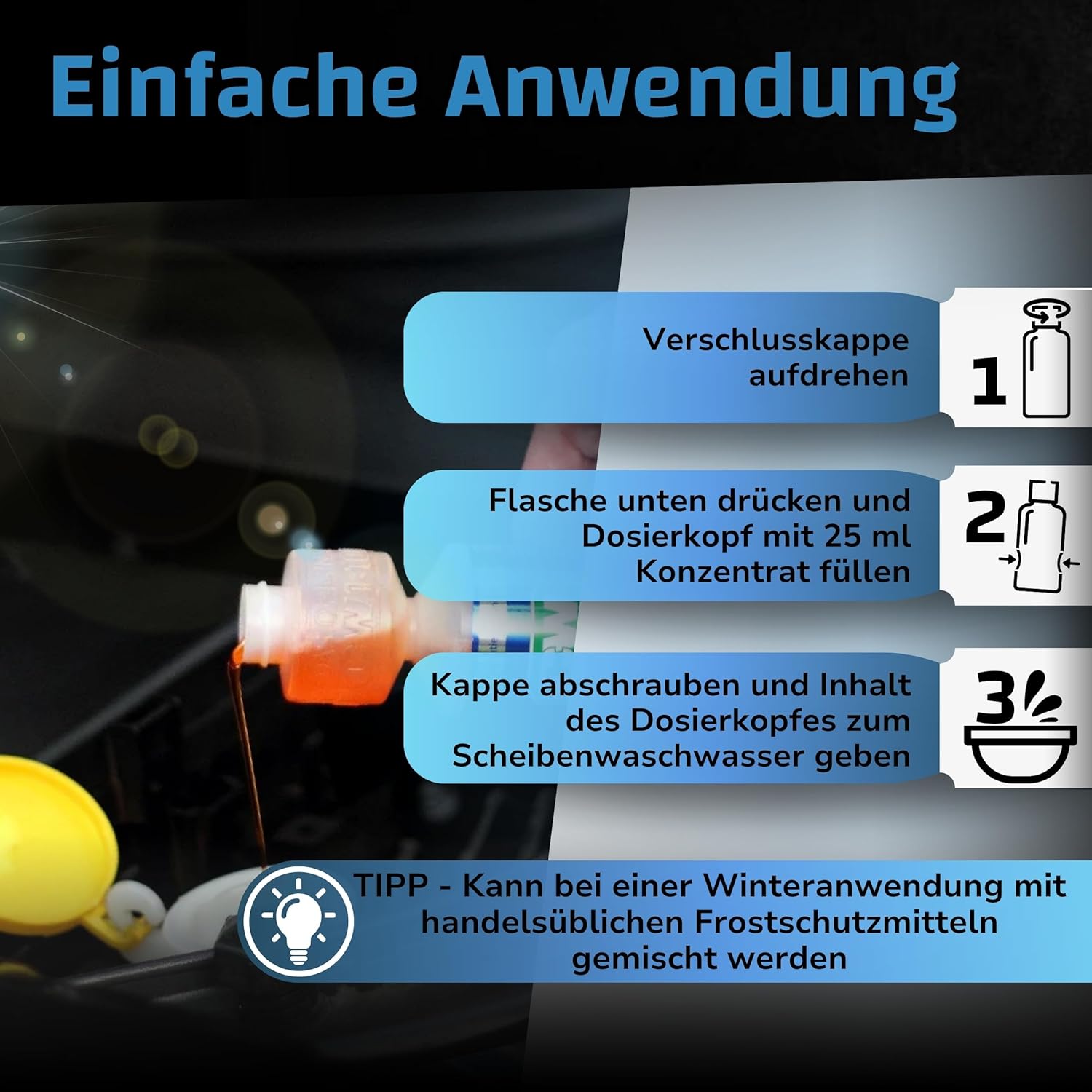 • Области на приложение: препаратът за почистване на автомобилни стъкла е подходящ за всички системи за почистване на предни стъкла и фарове, може да се използва целогодишно и може да се смесва с антифриз.