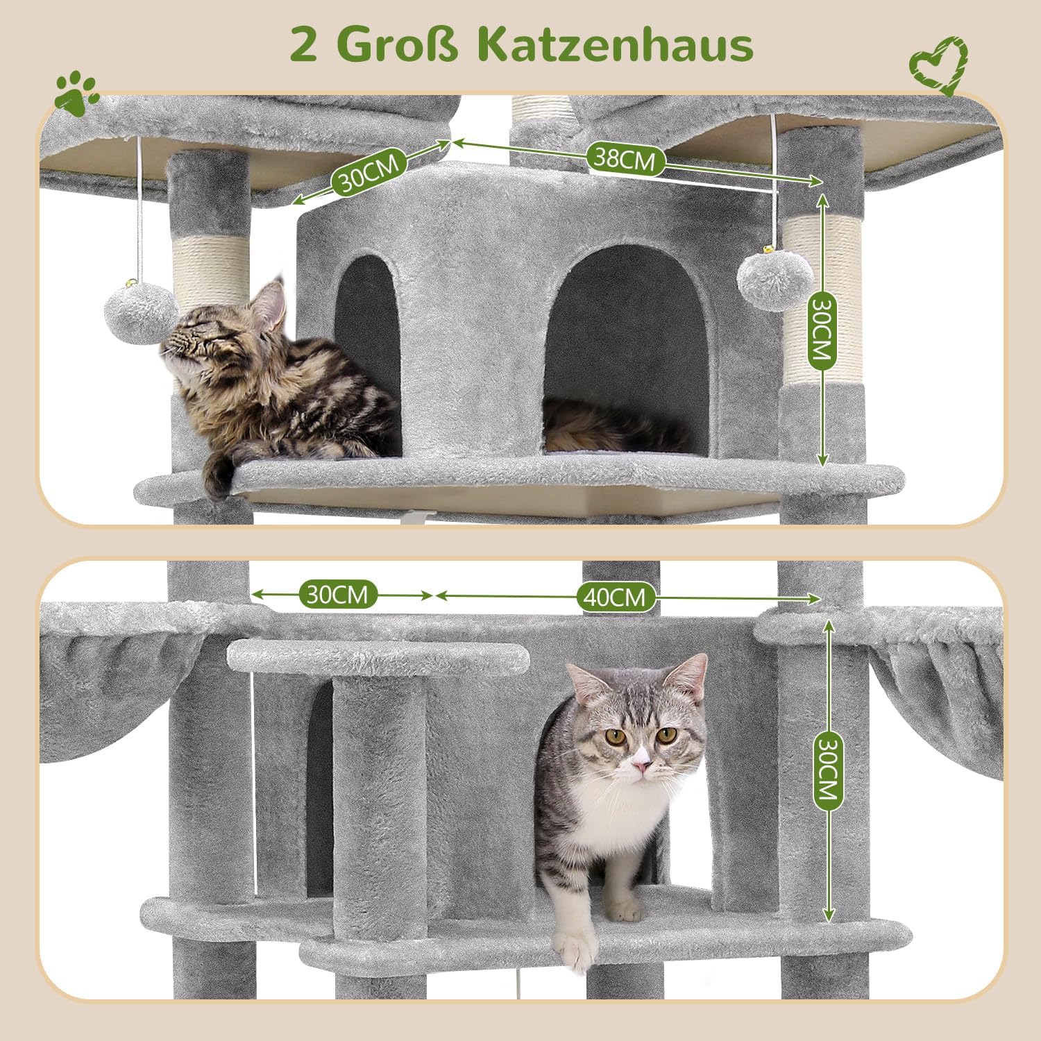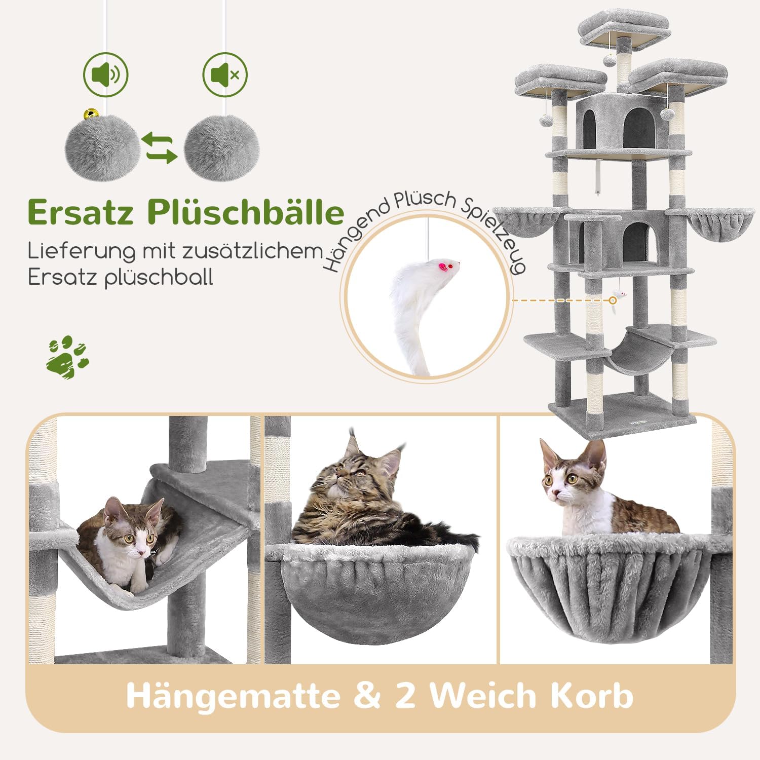 • Луксозна драскалка за котки за 3-5 възрастни котки: Дървото за котки с височина над 200 см предлага на котките множество възможности за почивка и игра с кацалки, къщички за котки, кошници, хамаци и плюшени играчки. Идеална е за семейства с 3-5 възрастни котки.