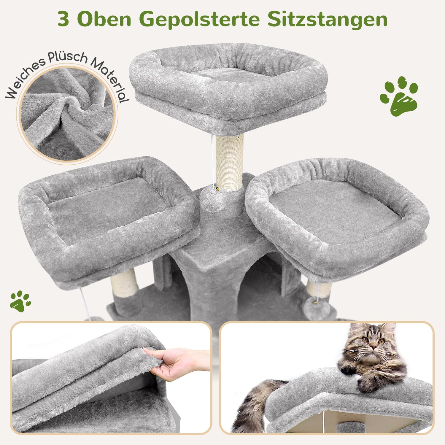• 3 кацалки, които се свалят за почистване: горната част на дървото за котки е оборудвана с три подплатени кацалки, които предлагат на вашите котки идеален наблюдателен пункт за наблюдение на територията им. Кацалките могат да се свалят за лесно почистване.