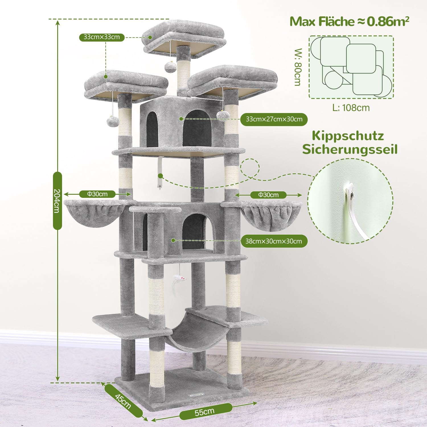 Драскалка Globlazer, голяма, висока 204 см, с 3 подплатени кацалки, 2 къщички за котки, 2 кошници, хамак, луксозно дърво за котки, стабилна за 3-5 възрастни, котка, почивка, игра, драскане на закрито (F80, светло сива)
