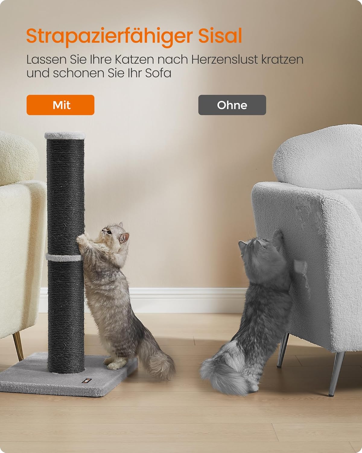 • Здрав сизал: остри нокти? Няма проблем! Тази котешка дървесина е обвита с износоустойчив сизал, издръжлив на интензивно драскане, като по този начин предпазва дивана ви от напукване.