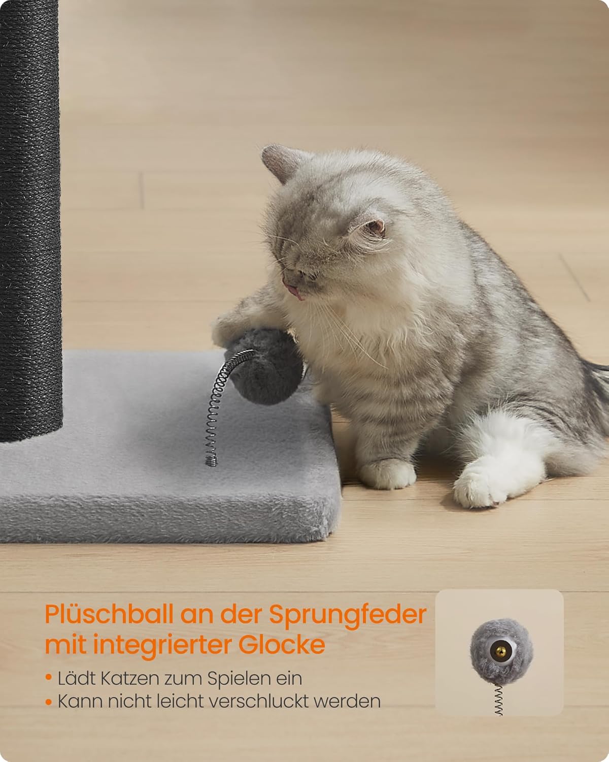 • Вградена камбанка за безопасност: плюшената топка на пружината има скрита камбанка вътре, която привлича котенцата да играят, като същевременно гарантира безопасност. Вашата любопитна любимка няма да може да ѝ устои!