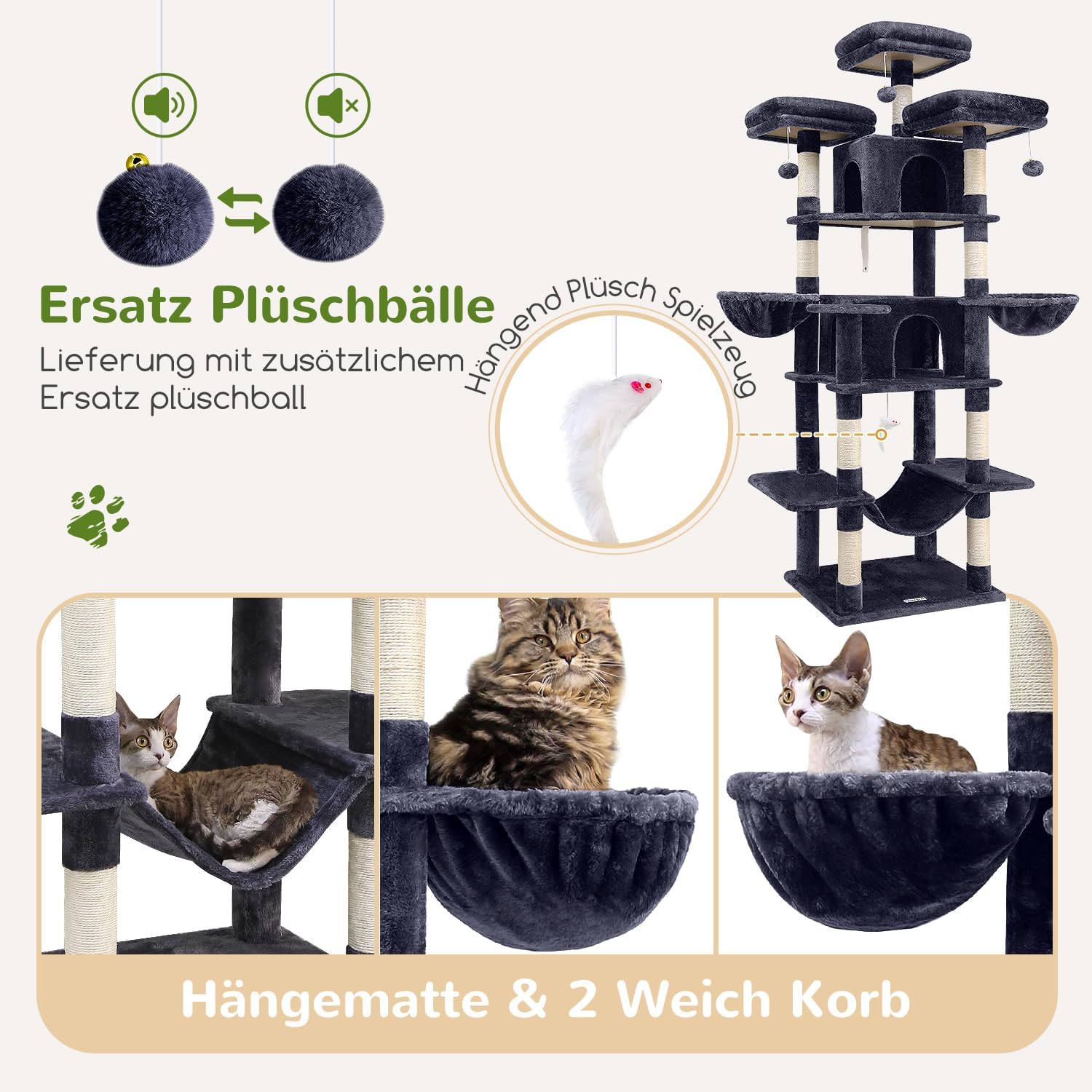 • Луксозна драскалка за котки за 3-5 възрастни котки: Дървото за котки с височина над 200 см предлага на котките множество възможности за почивка и игра с кацалки, къщички за котки, кошници, хамаци и плюшени играчки. Идеална е за семейства с 3-5 възрастни котки.