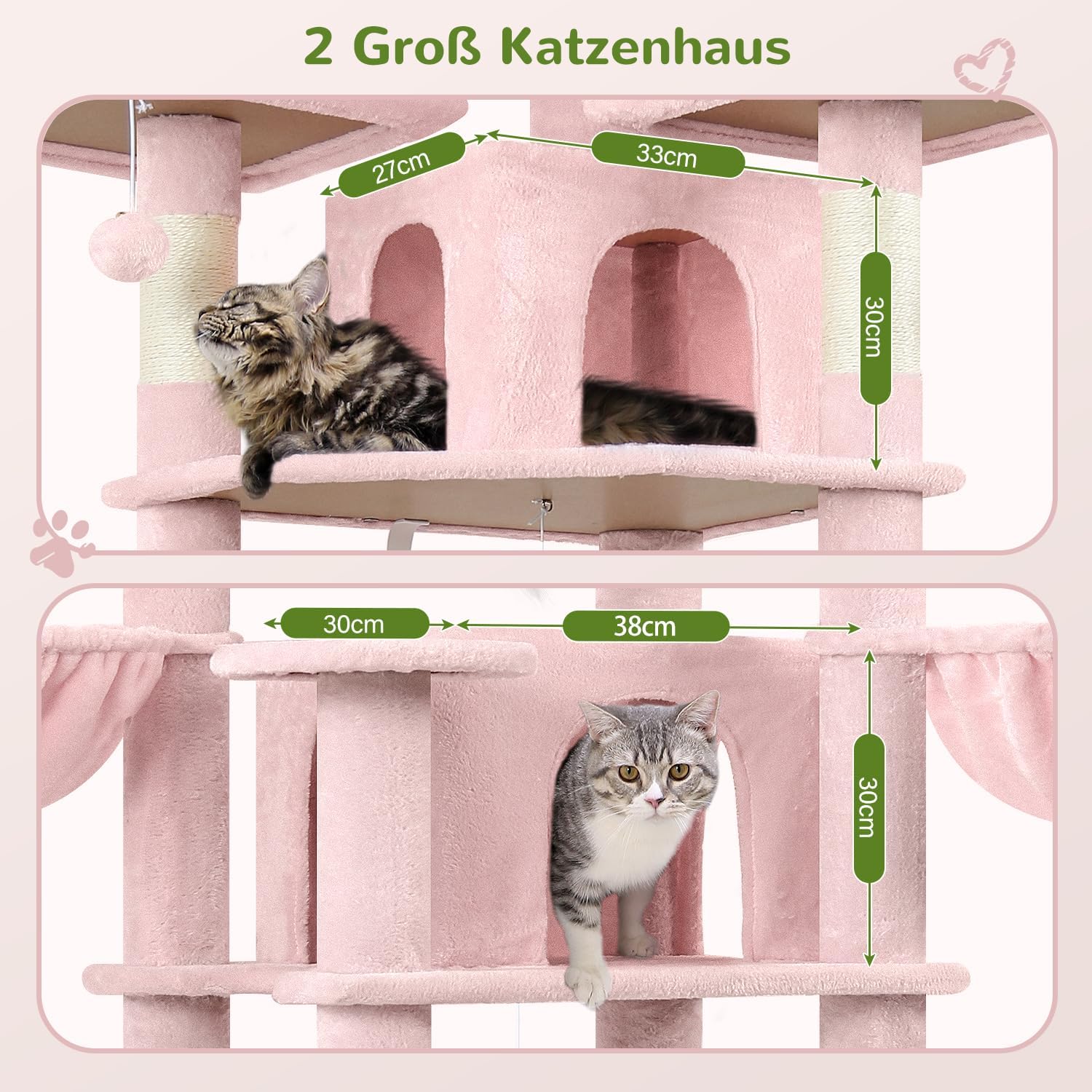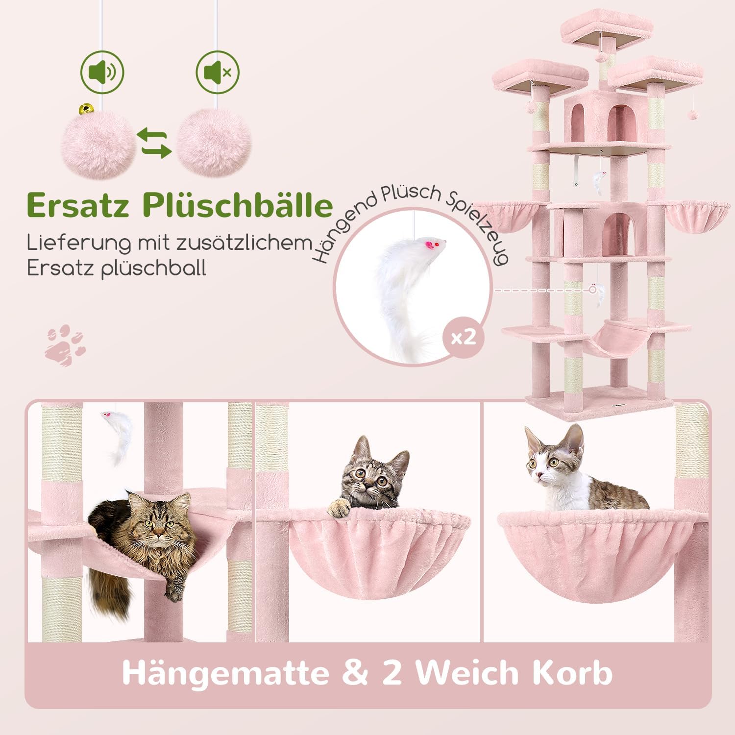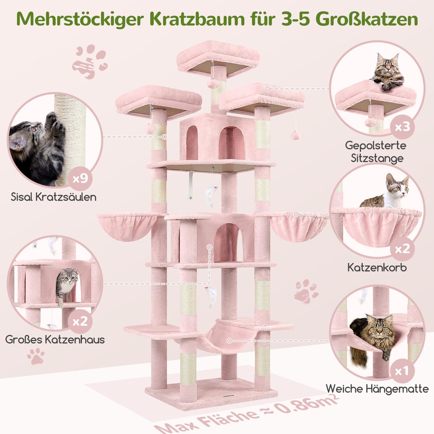 Драскалка за котки Globlazer, розова, голяма, XXL, висока 204 см, с 3 подплатени кацалки, 2 къщички за котки, 2 кошници, хамак, луксозно дърво за котки, стабилна за 3-5 възрастни, котка, почивка, игра, драскане (F80, розова)