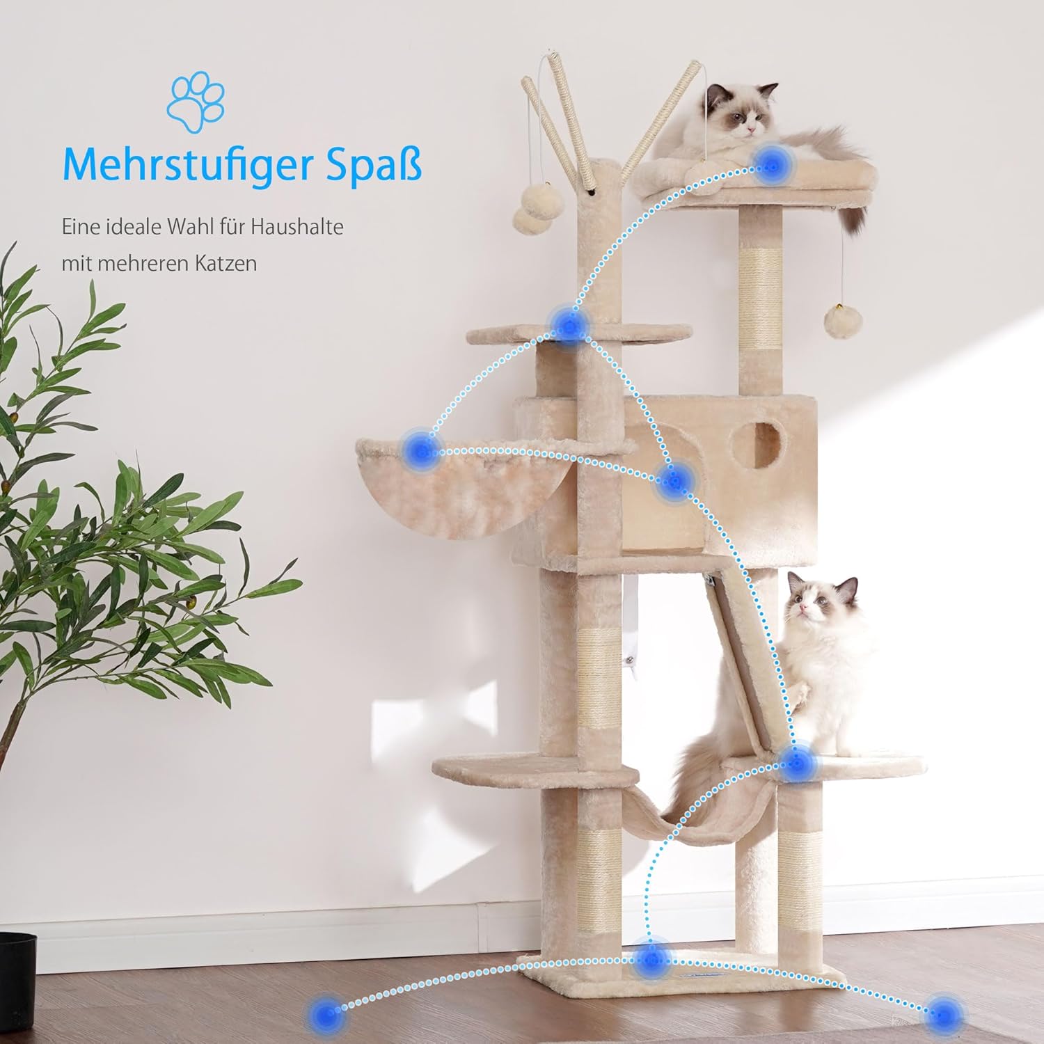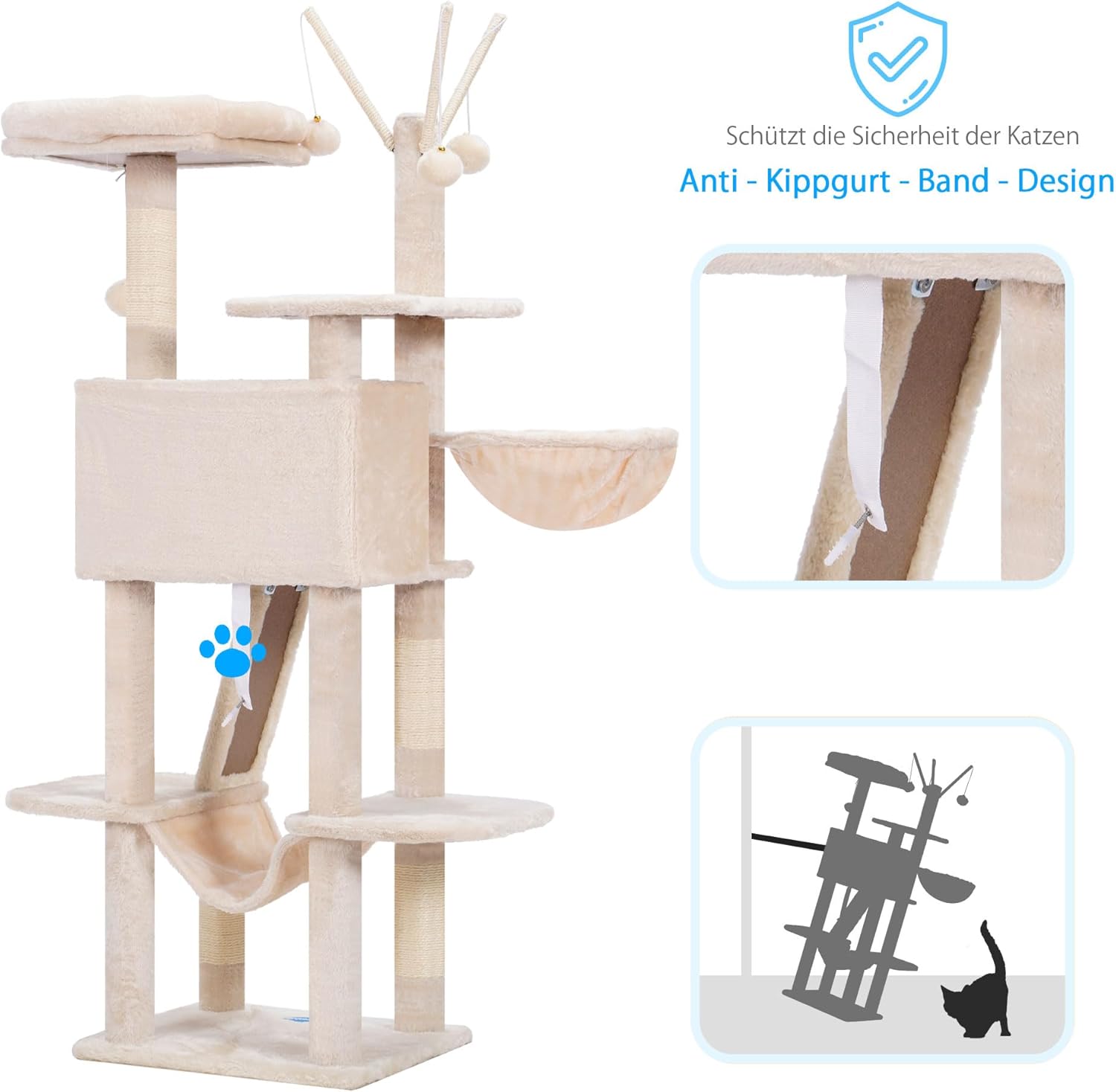 Драскалка за котки Hey-Brother MPJ019-SM, 135 см, вътрешна, с подплатено легло, топка за играчки, пещери, хамак и къщичка за котки от сизал, бежова