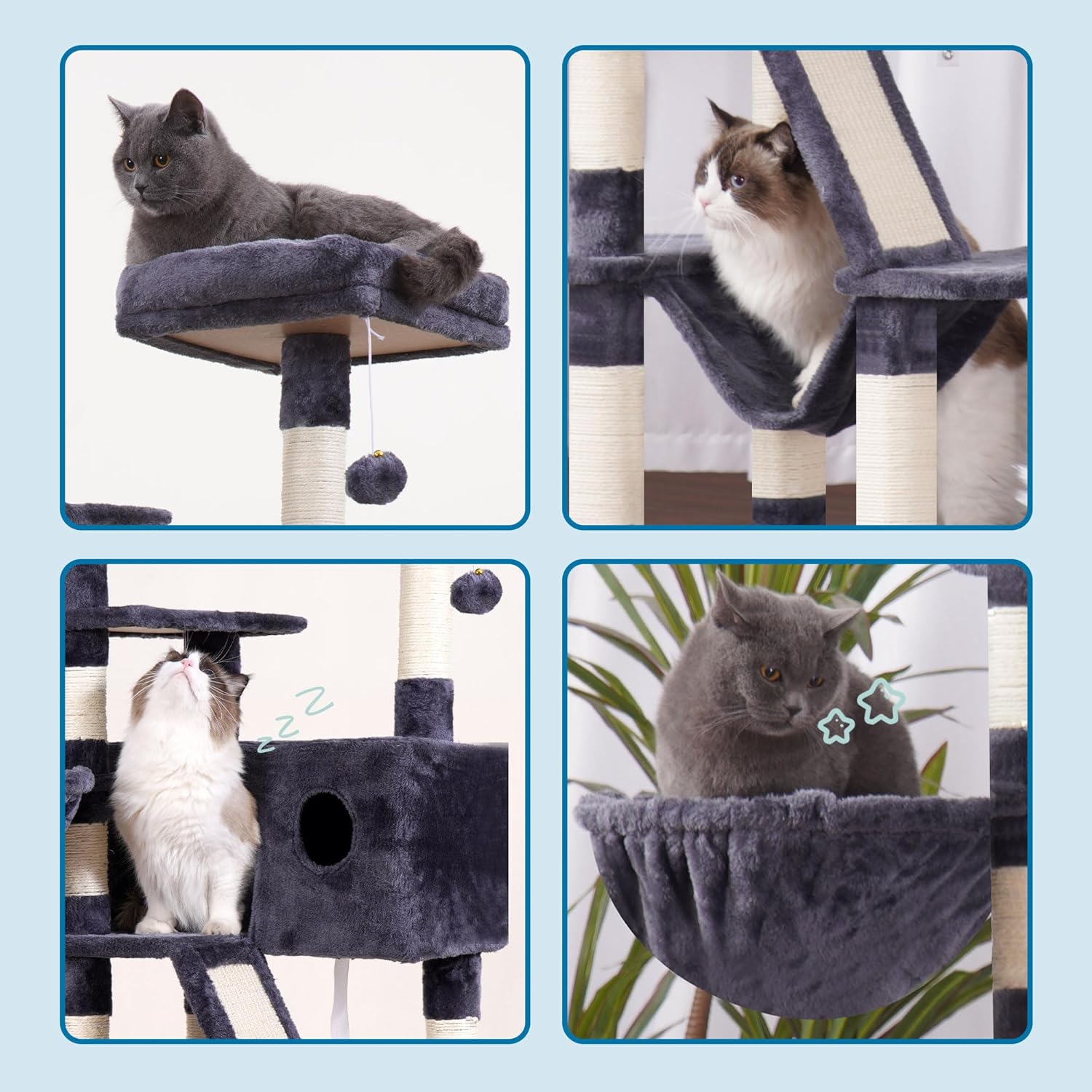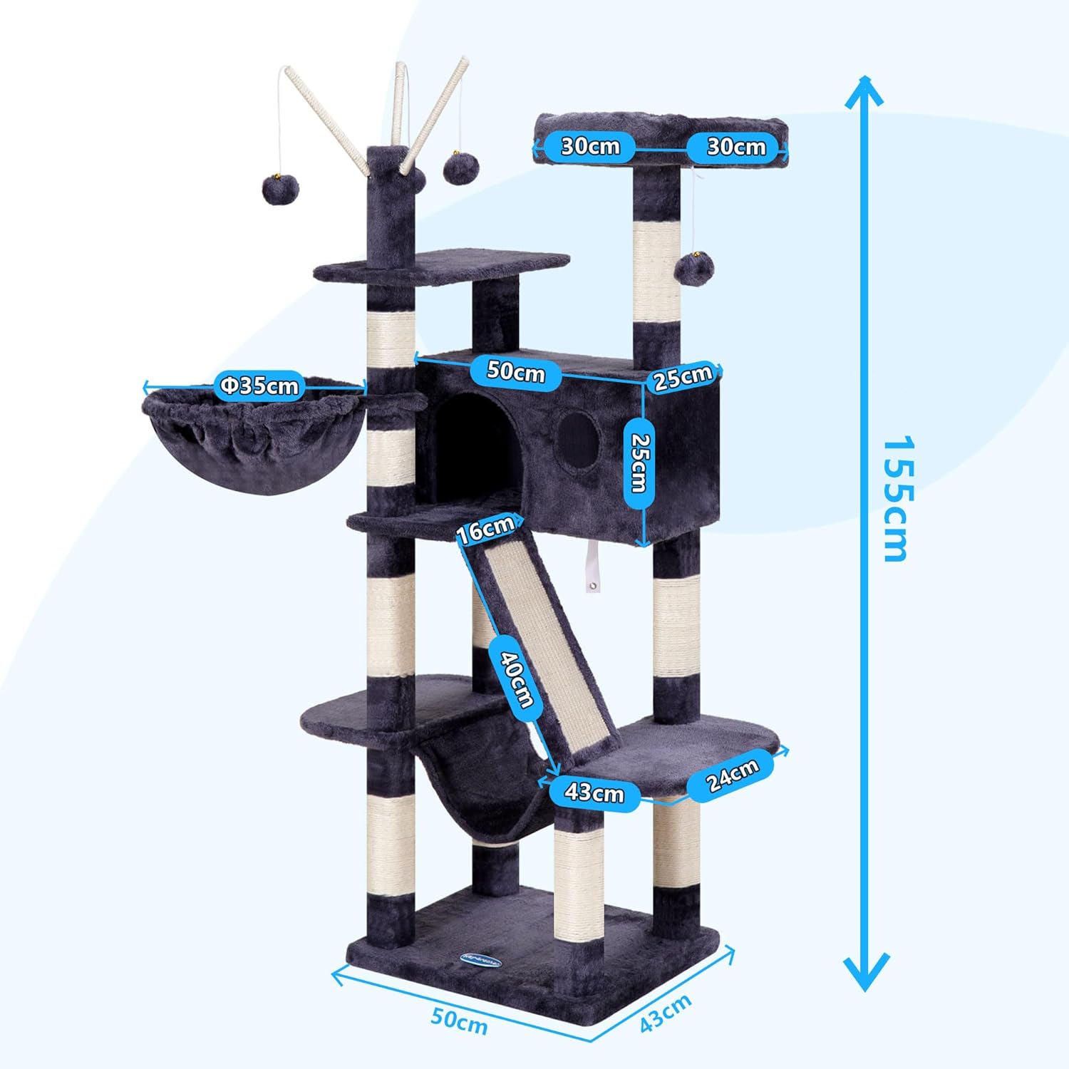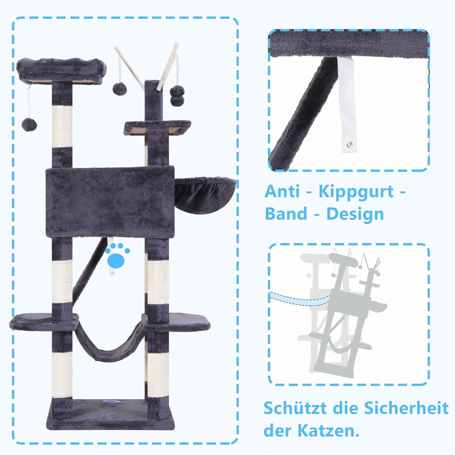 Драскалка за котки Hey-Brother MPJ019G, 154 см, вътрешна, с подплатено легло, топка за играчки, пещери, хамак и къщичка за котки от сизал, опушено сива