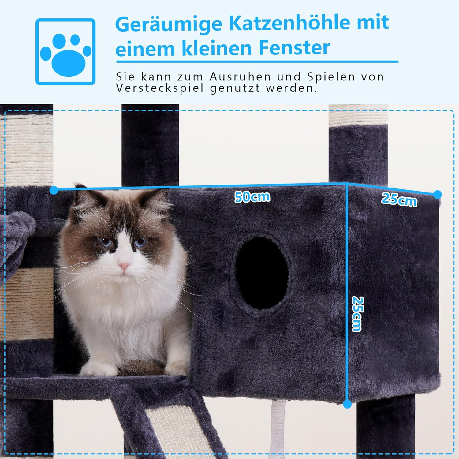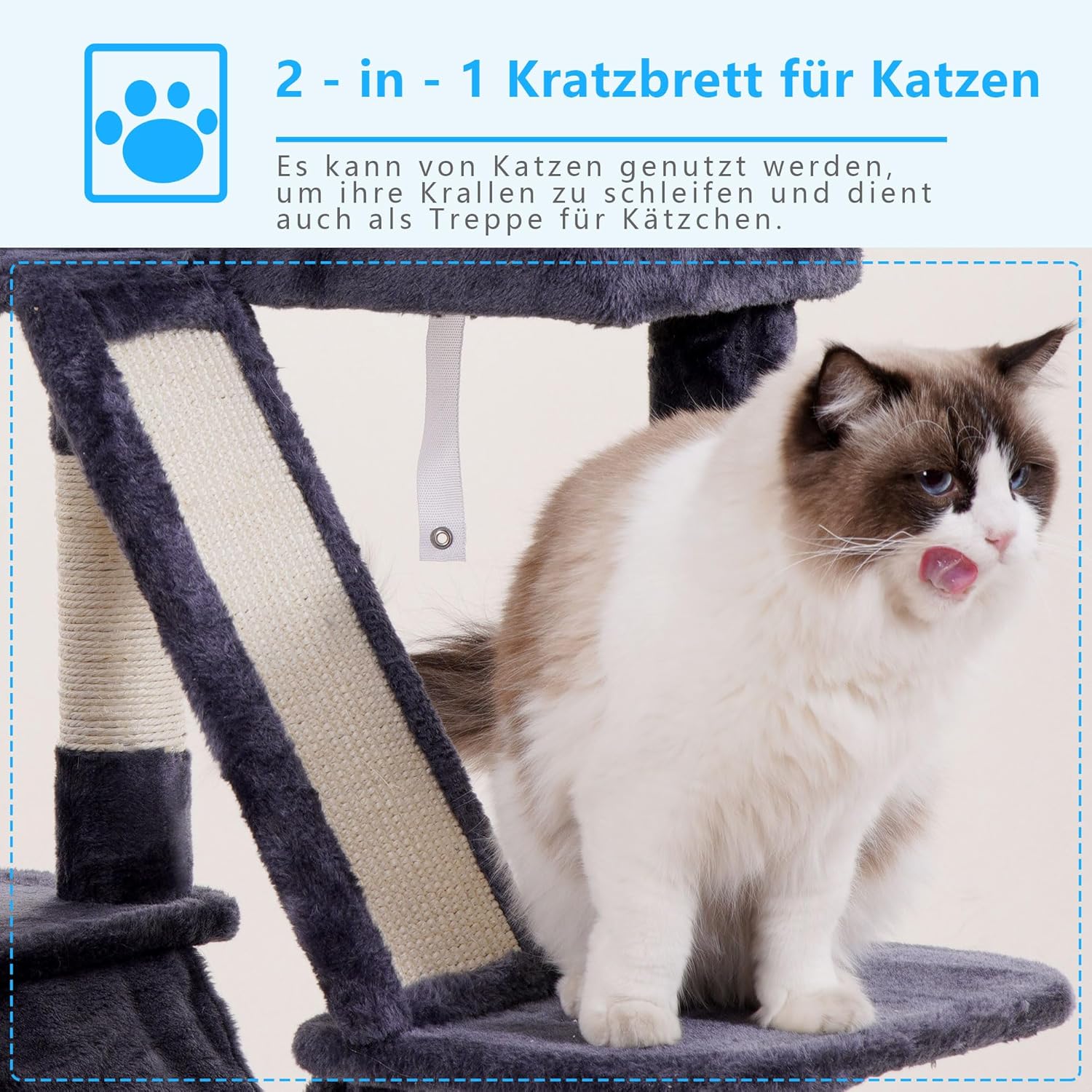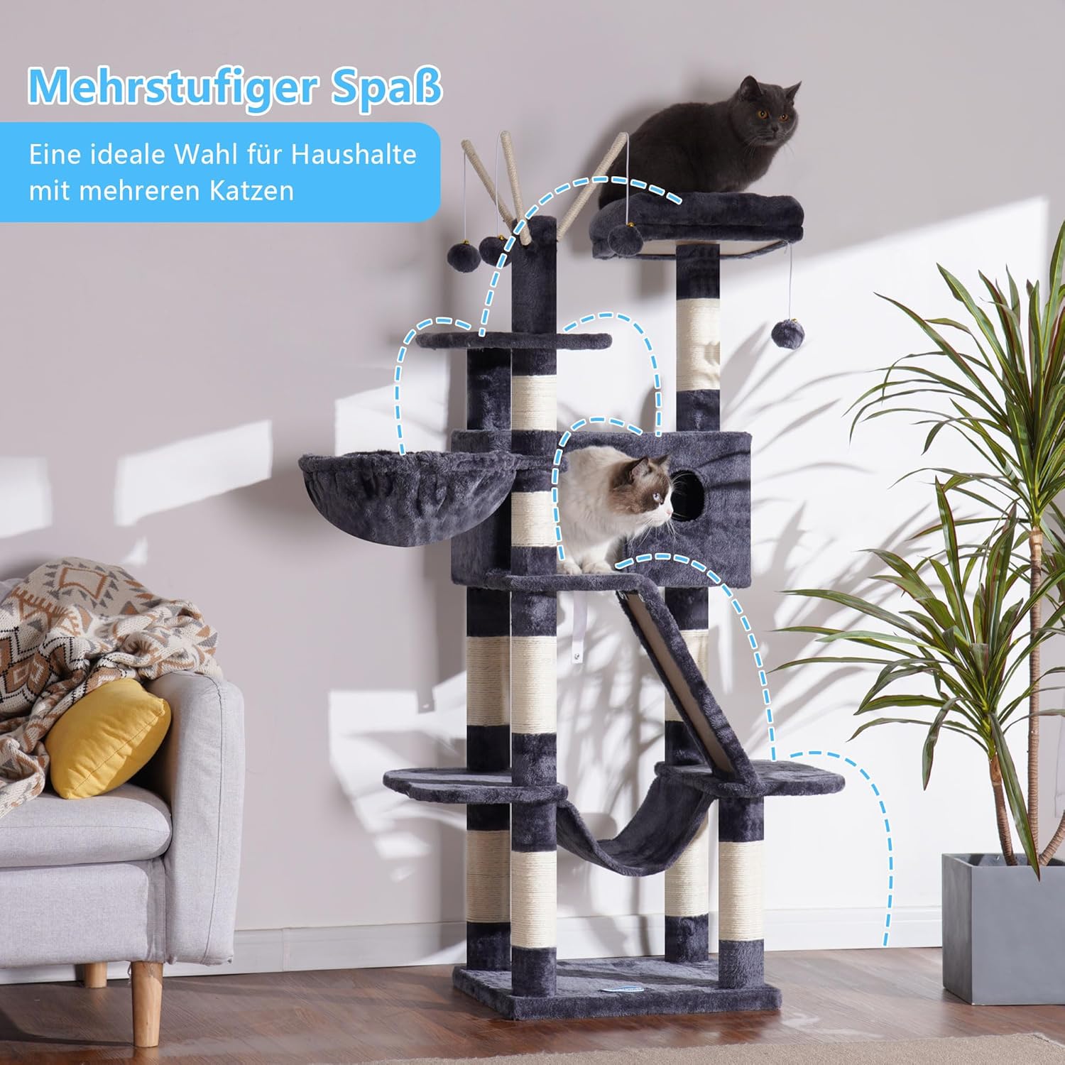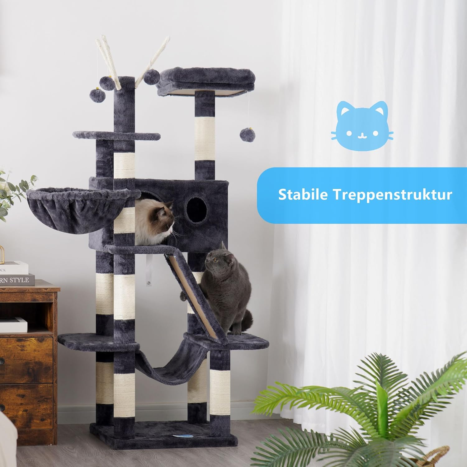 Драскалка за котки Hey-Brother MPJ019G, 154 см, вътрешна, с подплатено легло, топка за играчки, пещери, хамак и къщичка за котки от сизал, опушено сива