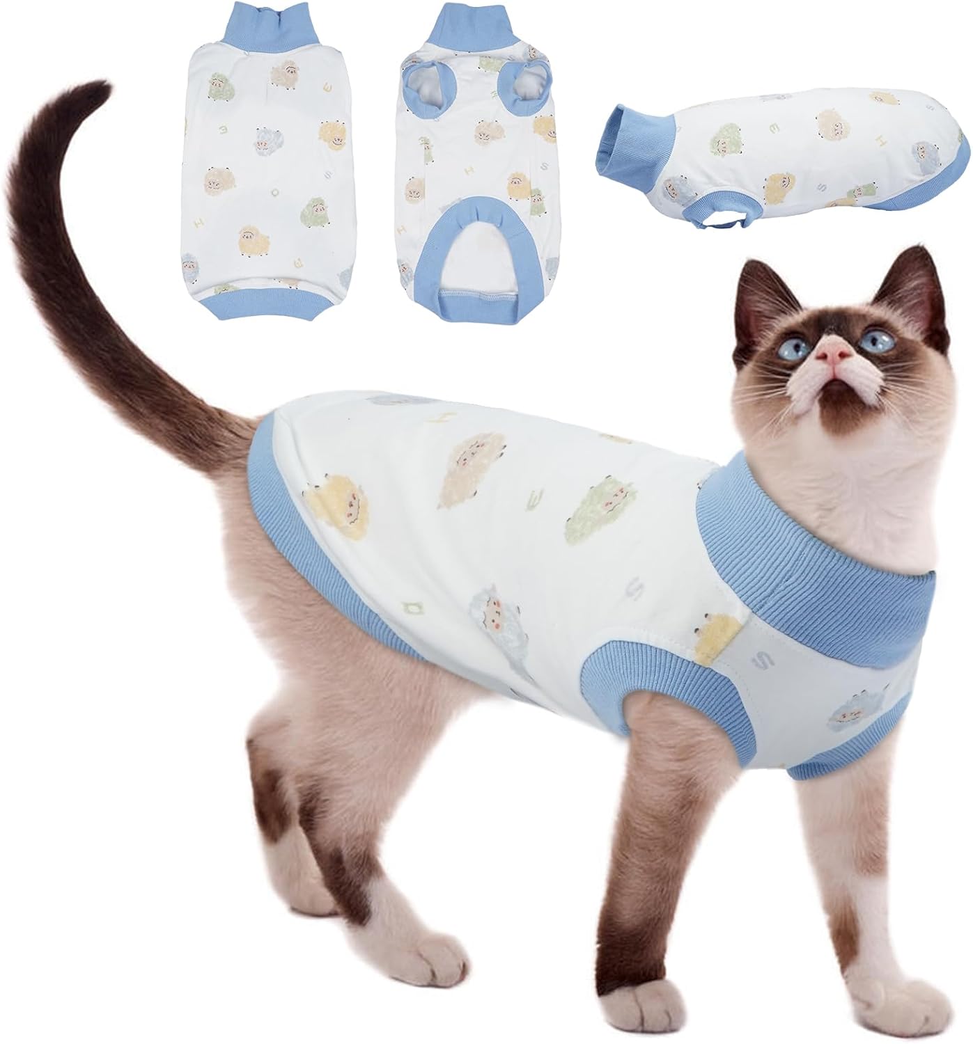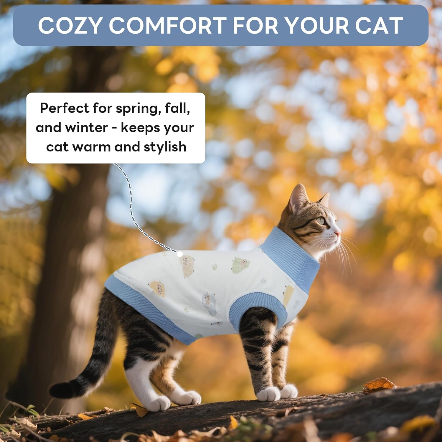 Дрехи за котки, Котешки пуловер от памук, Висока яка, Без ръкави, За чувствителни котки, Лека топлина за пролет/есен, Предпазва от ниски температури, Син, XS