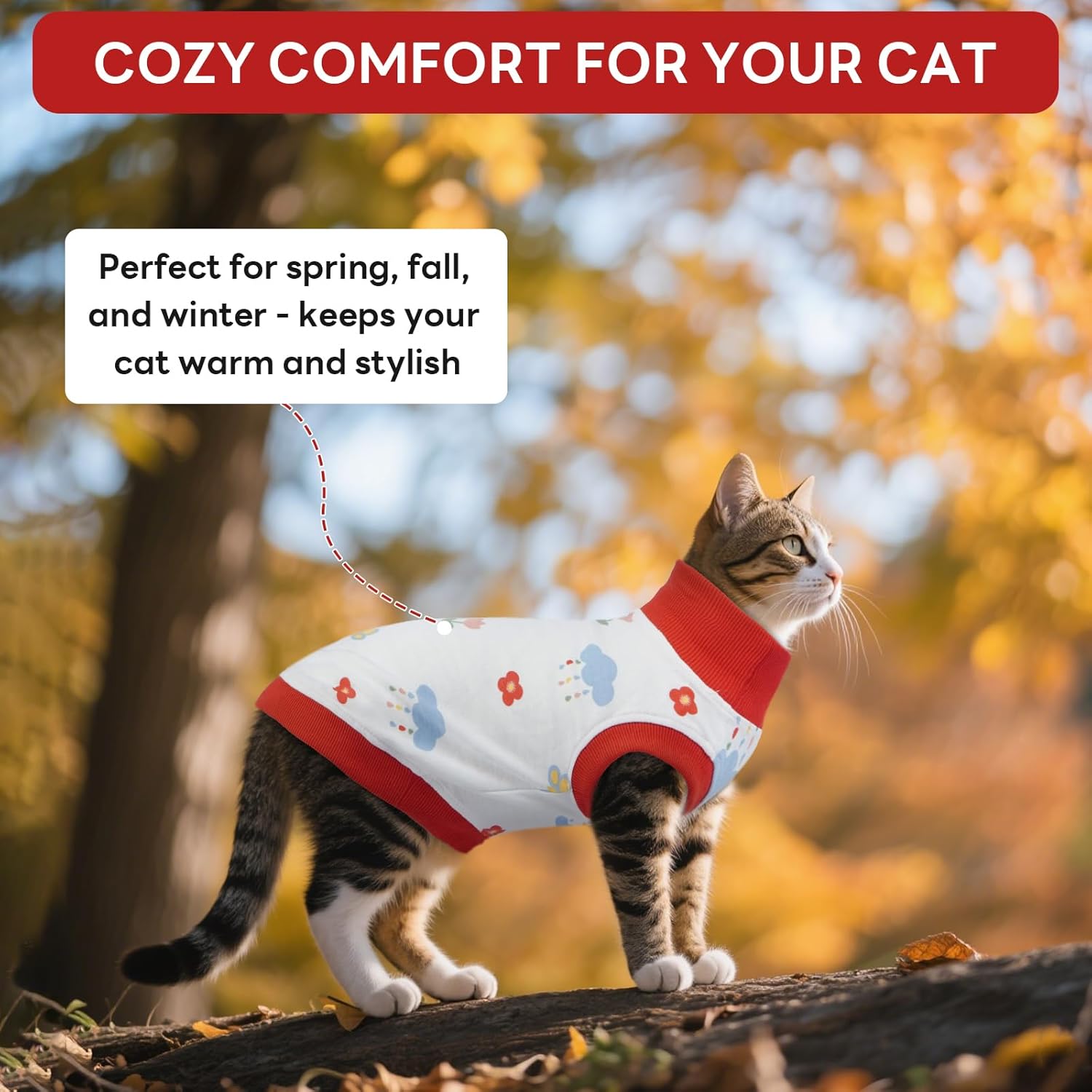 • Стилен принт – сладък за снимки или пътувания – предлага се в ярко червено или синьо, този стилен котешки костюм придава на вашия домашен любимец очарователен вид за ежедневна употреба. Независимо дали сте у дома, на посещение при ветеринар или по време на фотосесия – вашата котка винаги ще бъде перфектно показана. Направете визията на вашия домашен любимец уникална и шик с този стилен котешки пуловер.