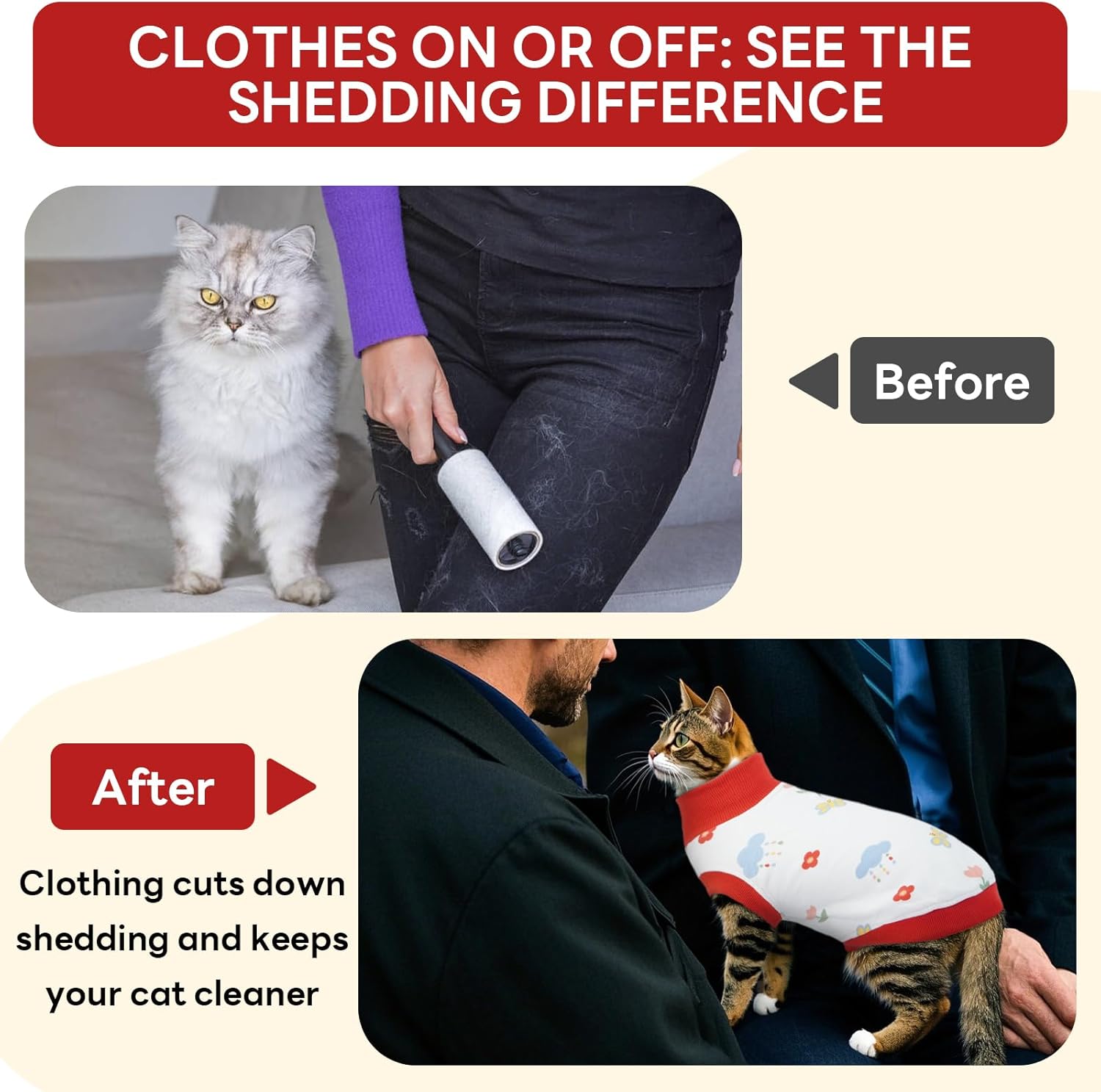 • Ежедневен комфорт при носене за контрол на козината и чисти апартаменти – спомага за намаляване на козината по мебелите, спалното бельо и дрехите. Идеален за домове с няколко котки или за страдащи от алергии, които искат да поддържат дома си по-чист и хигиеничен. Това решение за контрол на козината в котешките дрехи е важно допълнение към гардероба на вашата котка и улеснява справянето с разхлабената козина в домакинството.