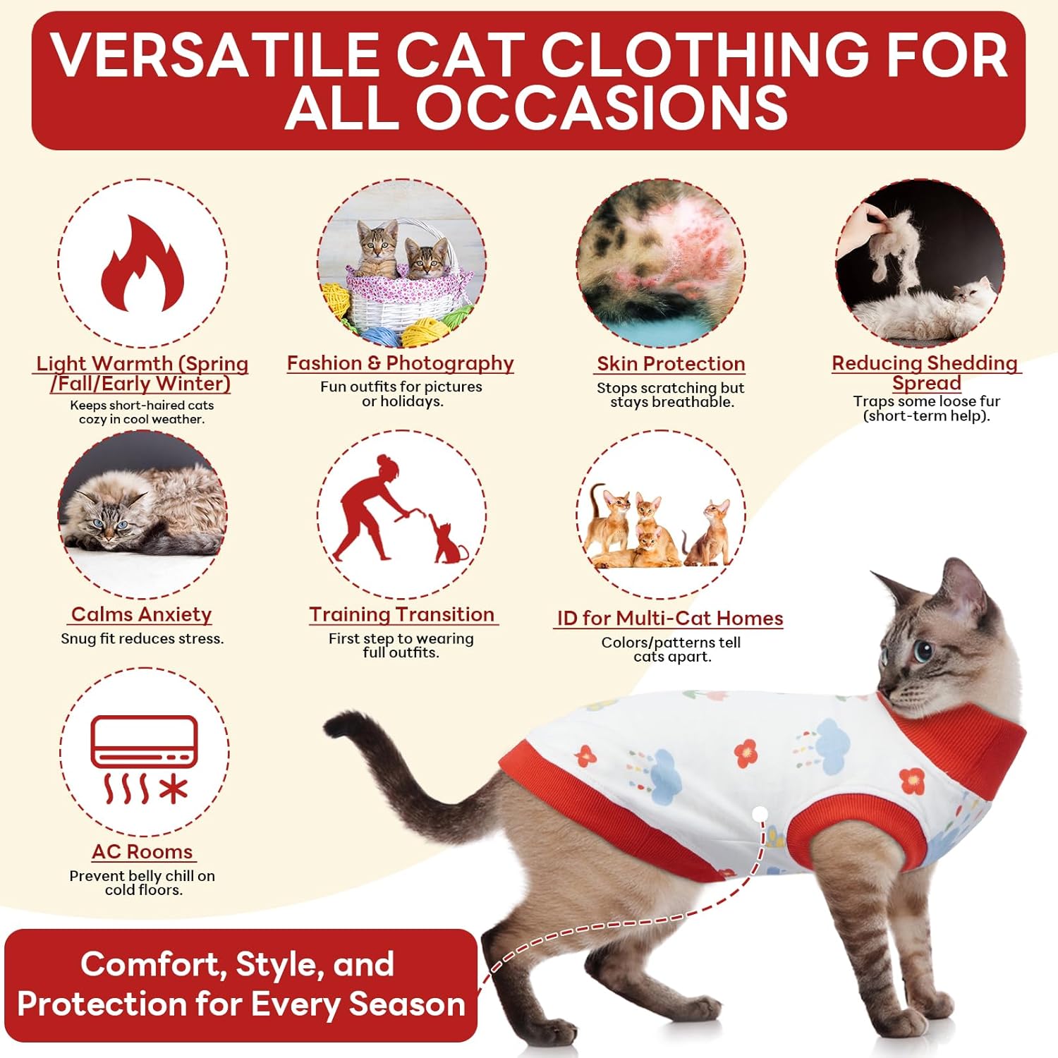 • Идеална за различни сценарии – независимо дали за пролетна/есенна топлина, носене в климатизирани помещения, посещение при ветеринар, успокояване на тревожни котки или просто за обучение на котката ви да носи дрехи за първи път, тази котешка дреха покрива всички ваши нужди. Тя е идеална и за млади котки или за запознаване с котешки дрехи за първи път.