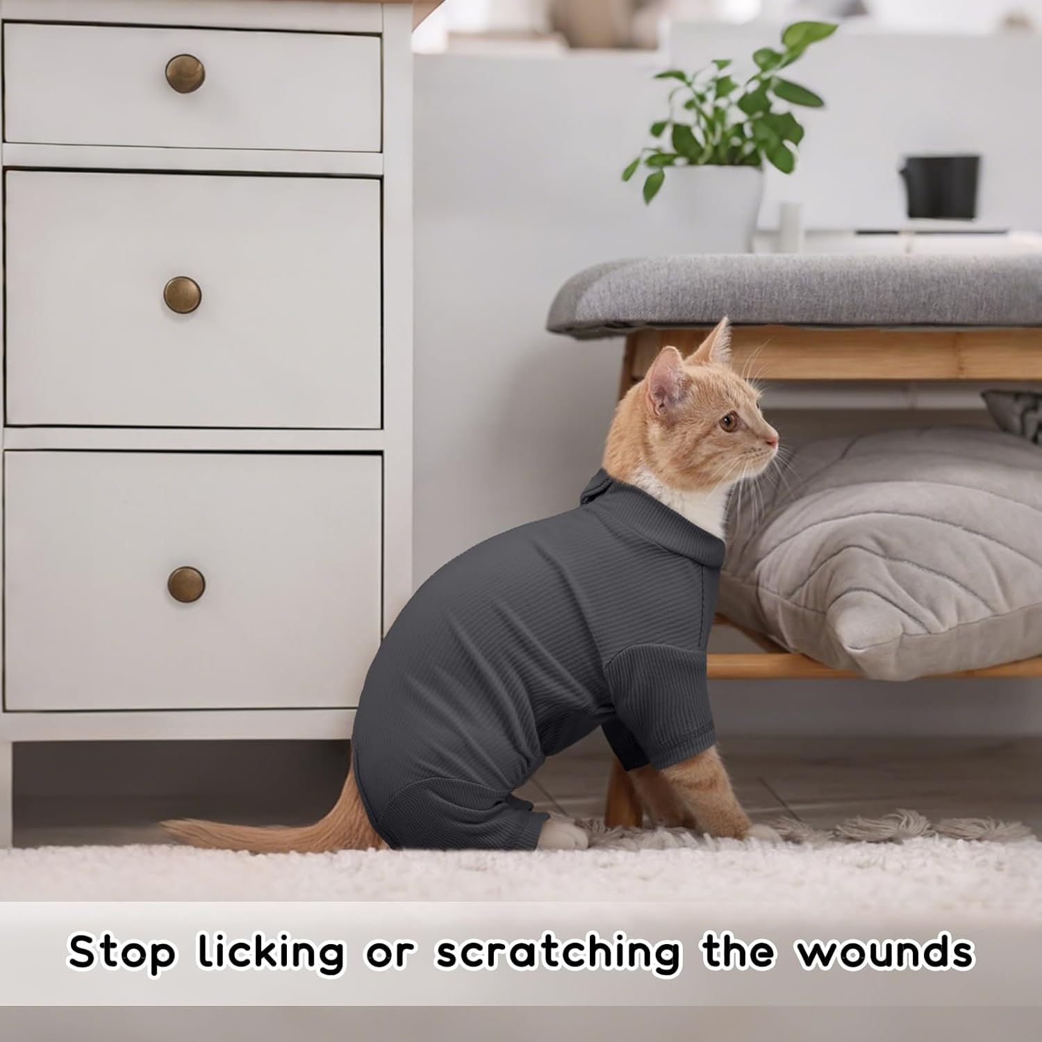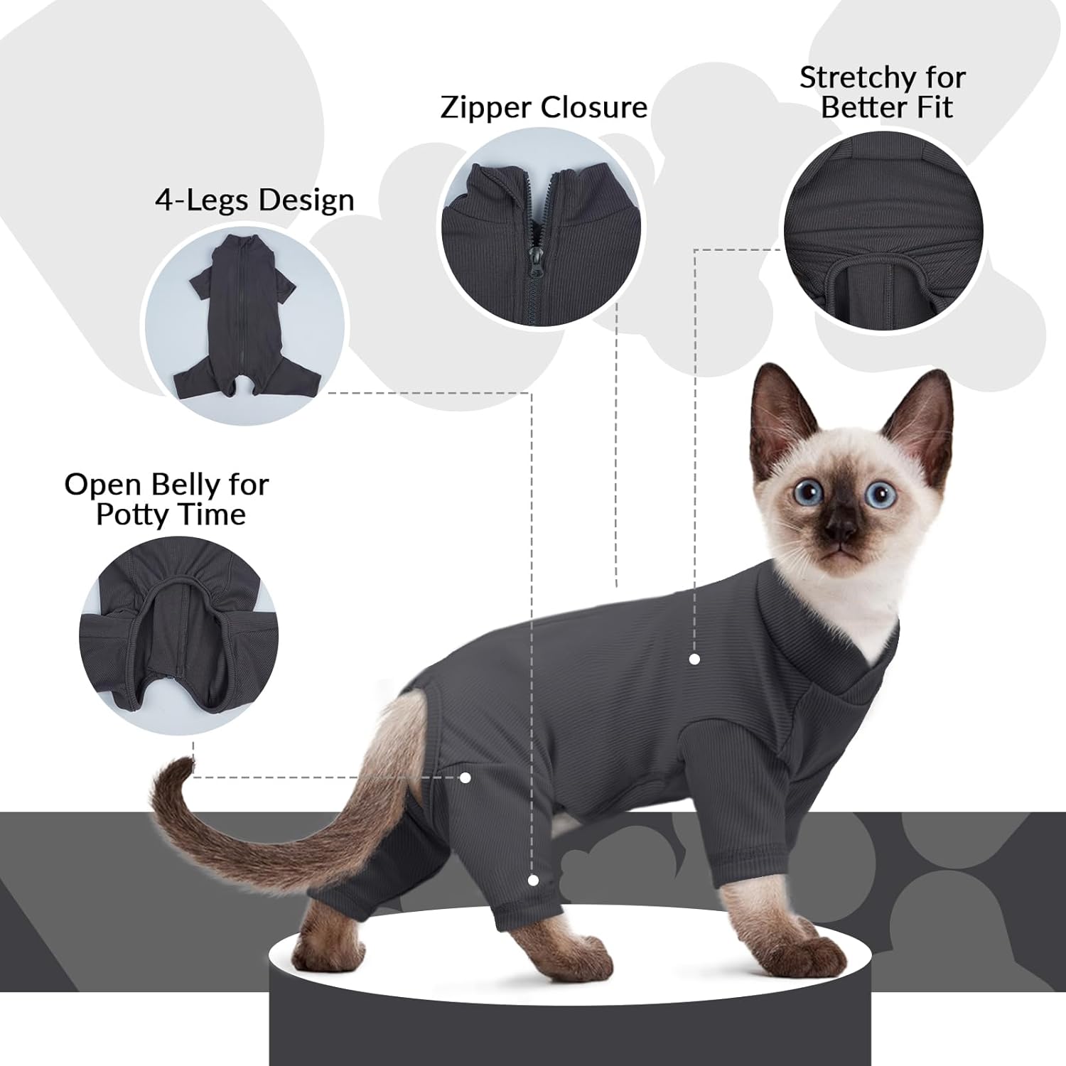 • Напълно защитен дизайн Четирикракият дизайн на котешкия гащеризон осигурява цялостна защита, а коремната част на котешката дреха е отворена за лесно прекарване на тоалетна. Той ефективно намалява косопада и държи котешката козина далеч от мебелите. Покрива рани, за да предотврати облизването им (Забележка: голям отвор на корема, не е подходящ като котешки гащеризон след кастрация или за покриване на коремни рани).