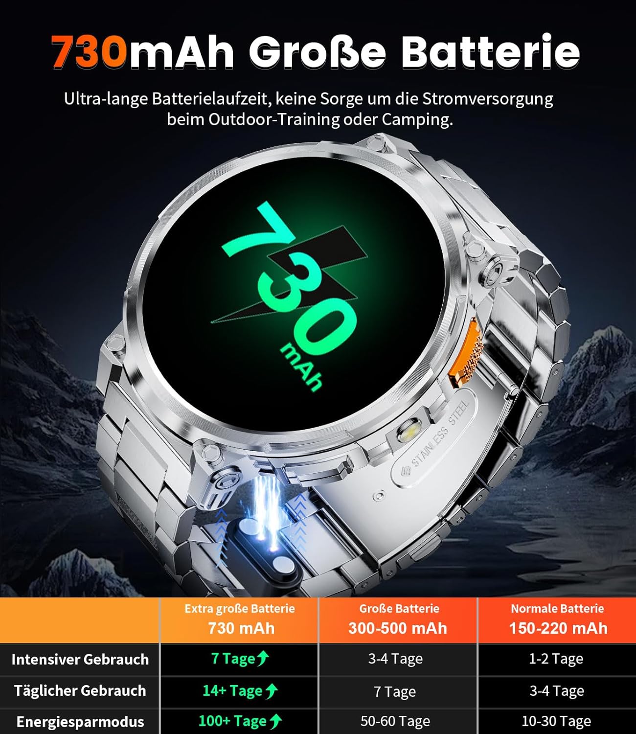 • Батерия от 730 mAh за 50 дни дълъг живот на батерията: батерията от 730 mAh с изключително дълъг живот на работа позволява живот на батерията над 15 дни и време на готовност над 45 дни, така че смарт часовникът винаги е напълно зареден, когато го носите. Времето за зареждане е само 2 часа. Този издръжлив смарт часовник е добър избор както за подарък, така и за носене.