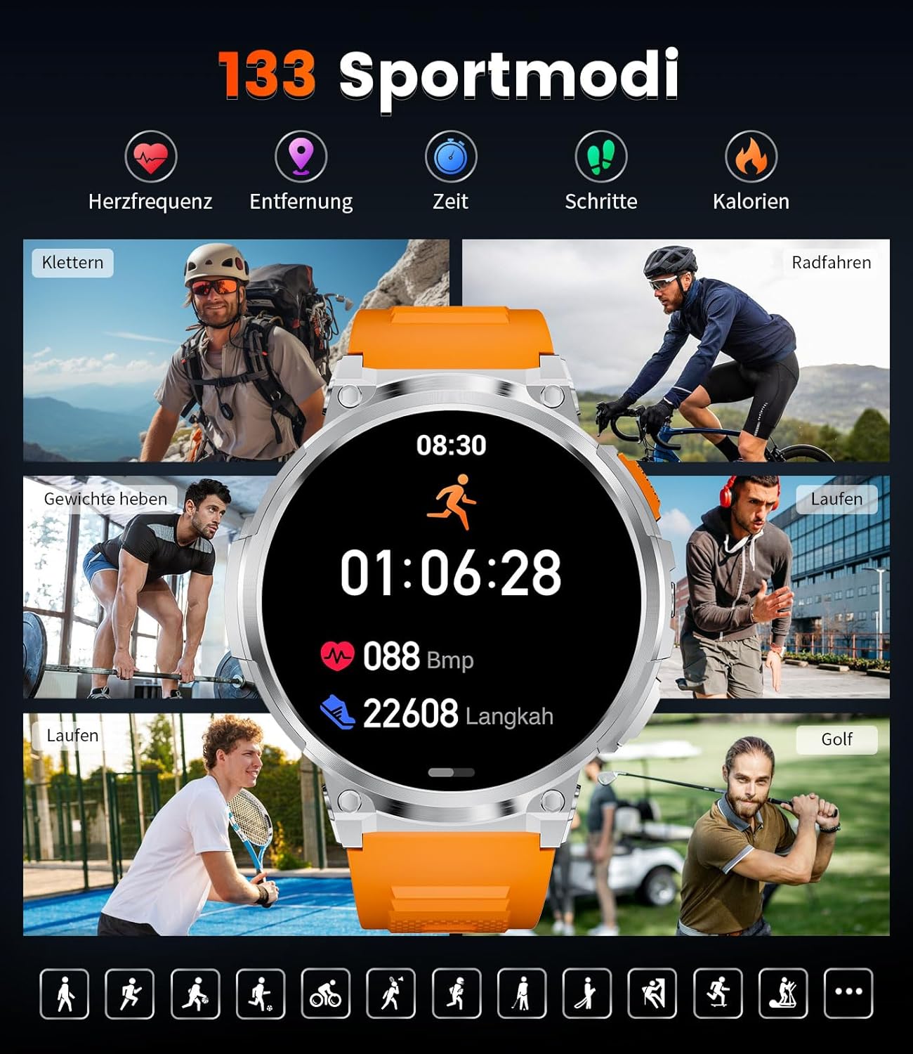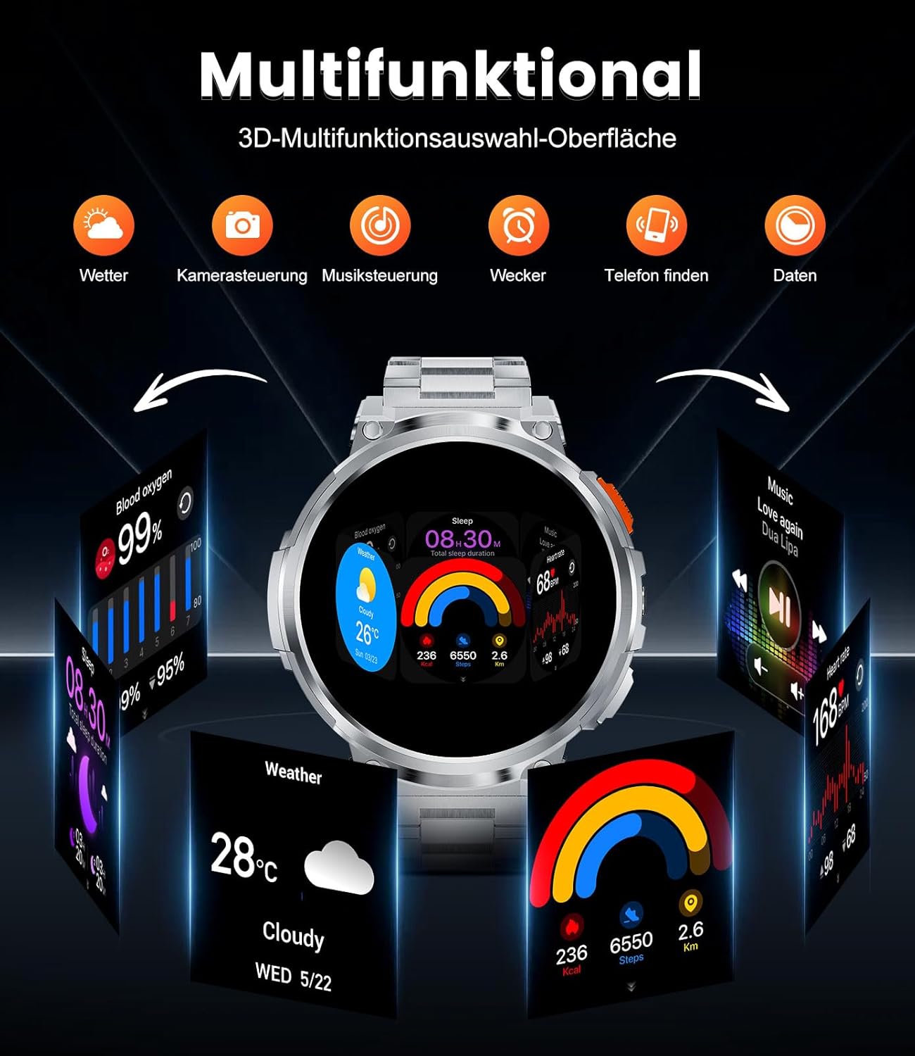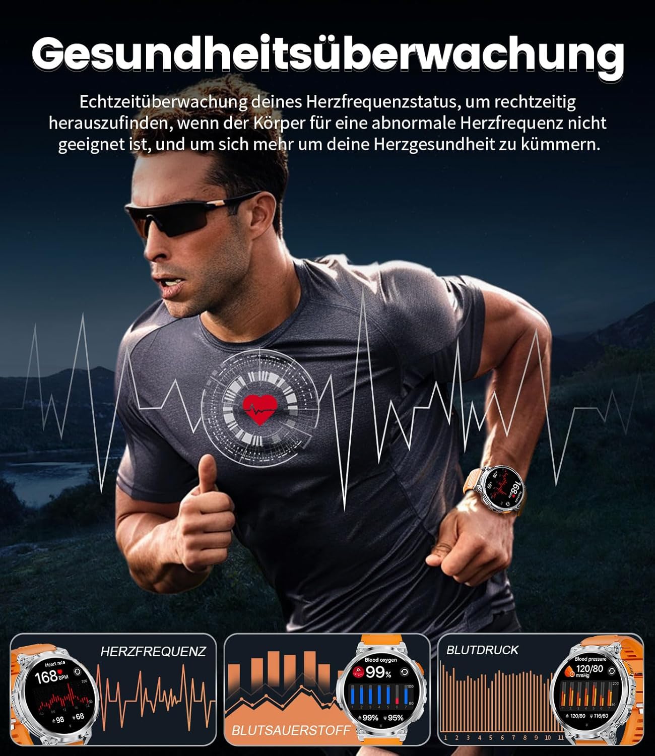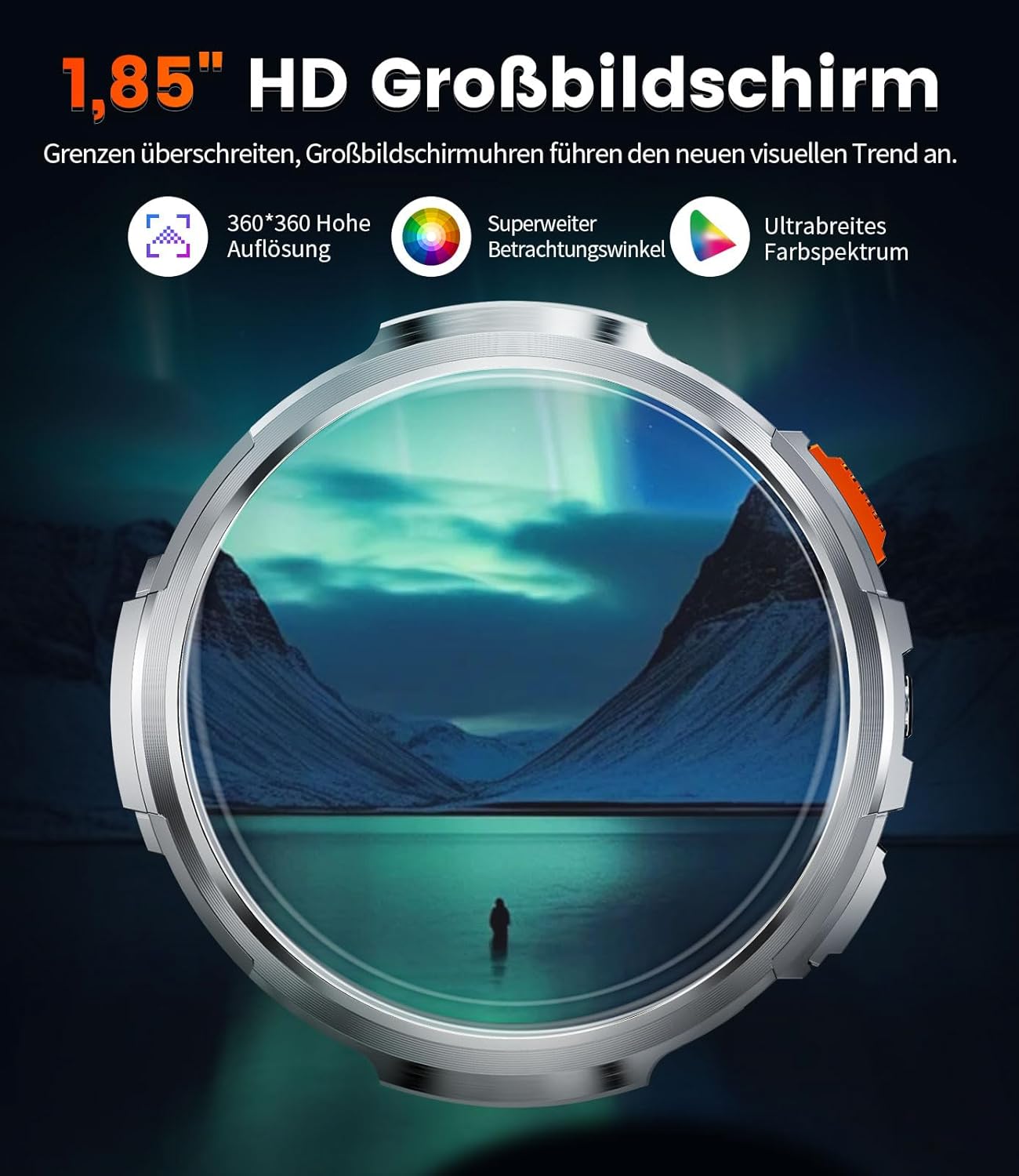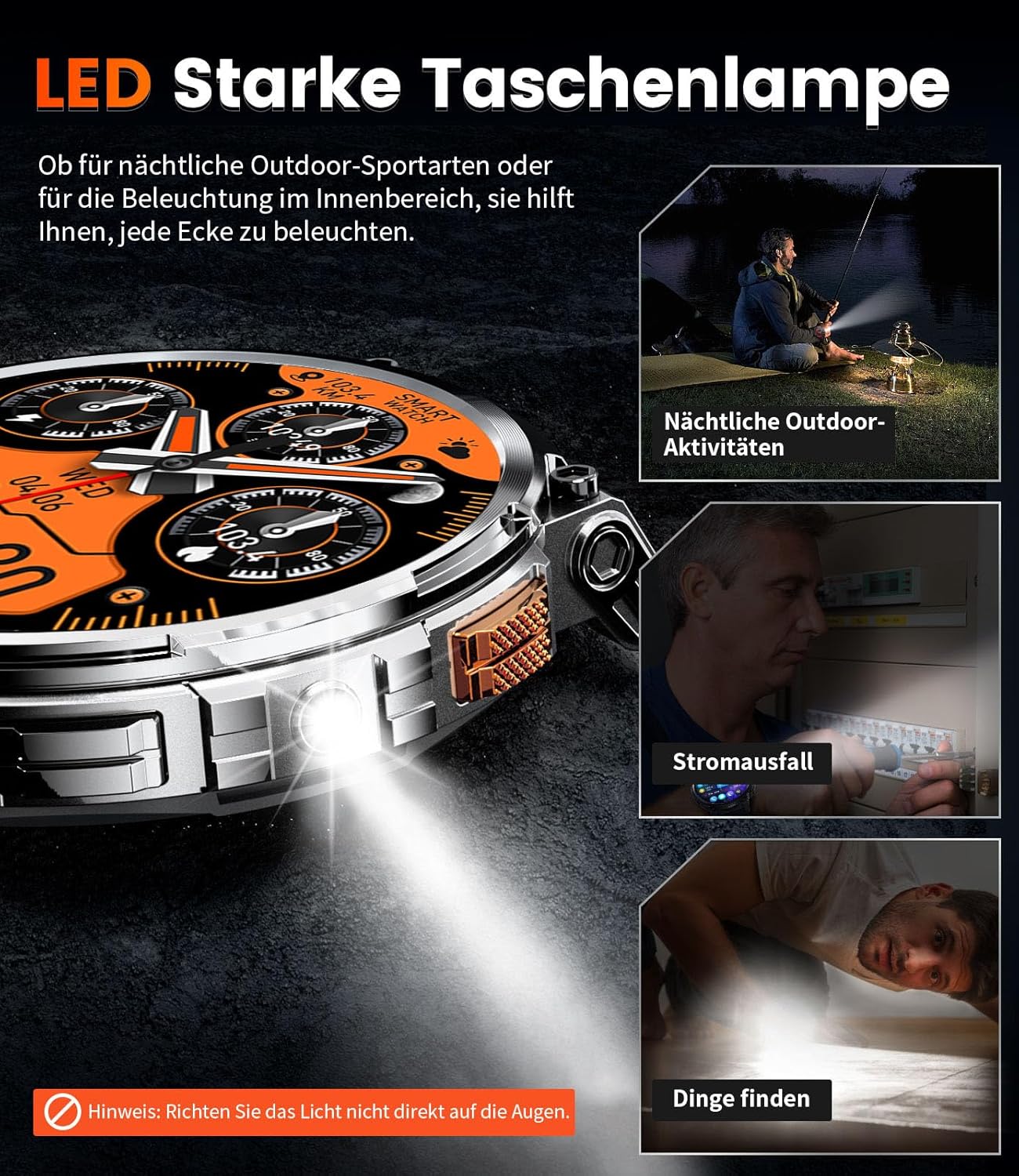 • 1,85-инчов мъжки смарт часовник с голям екран и LED фенерче: Този Android смарт часовник за мъже се предлага с чудесен 1,85-инчов IPS екран, който ви предлага голям, ясен и ярък дисплей на съдържанието. Яркостта на екрана е регулируема и е устойчив на надраскване. Разполага с повече от 150 циферблата за едновременно изтегляне и превключване. Допълнителното LED фенерче отстрани осигурява над 2 часа осветление, когато бягате през нощта, на открито и при спешни случаи.