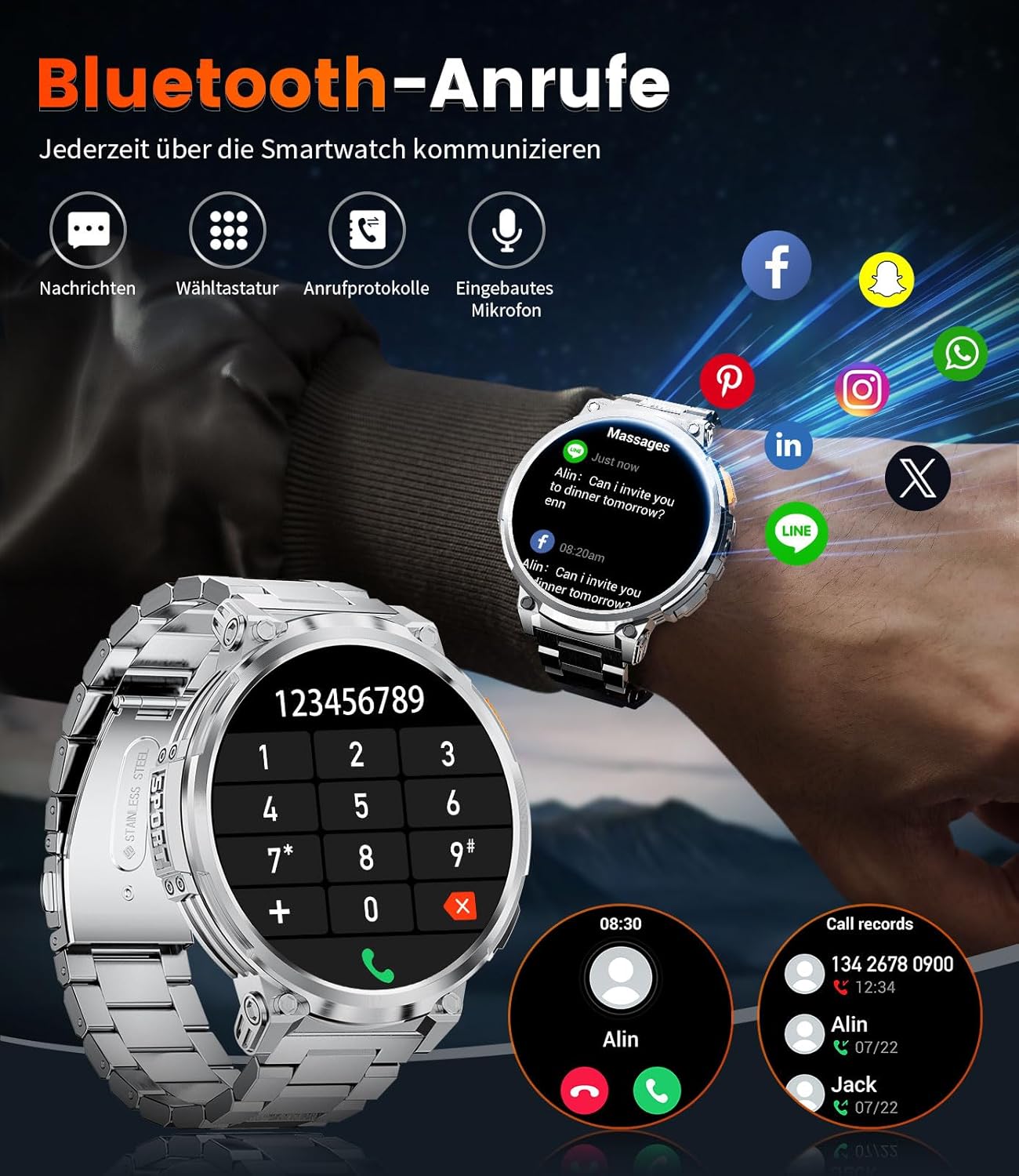 • Известия за обаждания и съобщения чрез Bluetooth: мъжкият смарт часовник DREMAC 2024 с функция за телефон има вграден микрофон и високоговорител за стабилна връзка чрез Bluetooth 5.0 технология с едно щракване. Позволява ви да осъществявате и приемате обаждания на вашия смарт часовник, да получавате известия от мобилен телефон и да бъдете предупреждавани чрез вибрационен мотор. Край на пропускането на важни обаждания и известия. Можете също да добавяте контакти, да преглеждате дневници с обаждания и много други на вашия часовник.