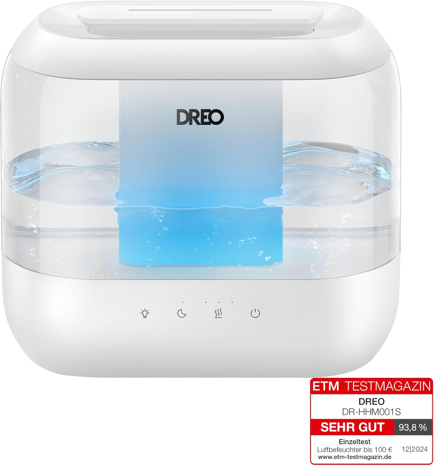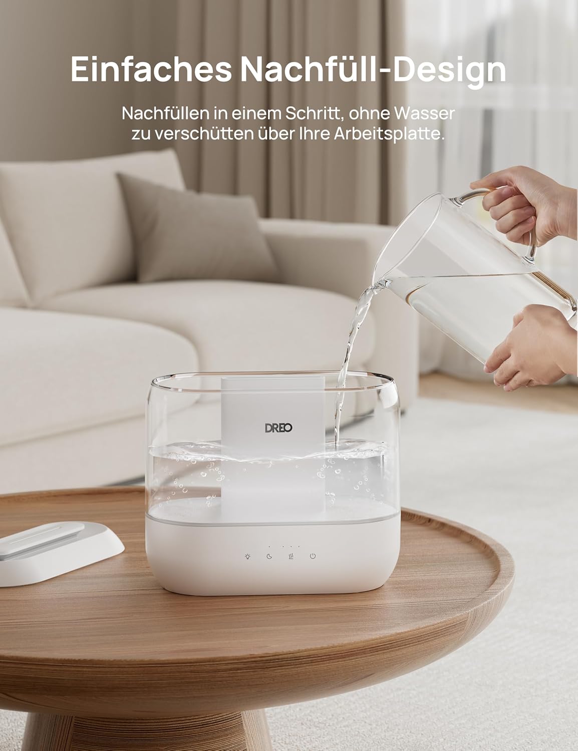 • Голям резервоар с обем 4 литра за непрекъснат комфорт: насладете се на спокоен сън без запек, кашлица или сухота в устата. Ултразвуковата пулверизация Dreo намалява нивото на шум до 28dB, докато резервоарът с обем 4 литра осигурява влага до 32 часа без необходимост от пълнене.
