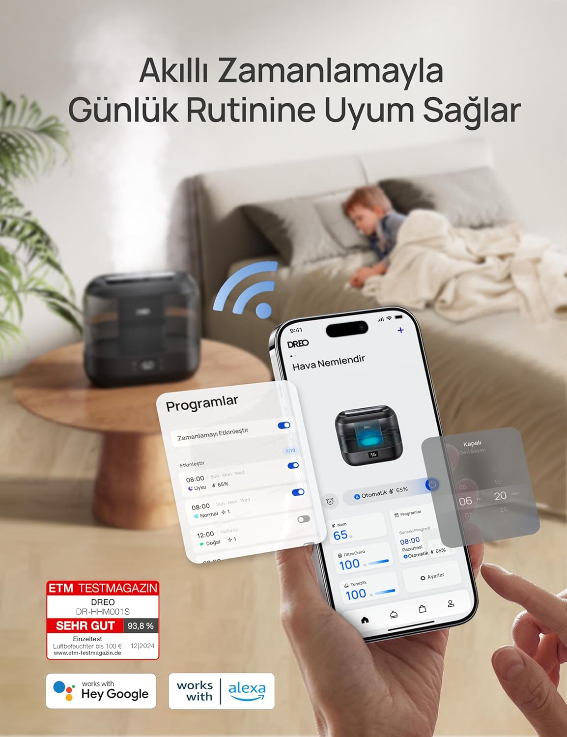 • ПРЕЦИЗНА ВЛАЖНОСТ ПО-ДОБЪР КОМФОРТ С интелигентния овлажнител Dreo за спалня най-накрая можете да контролирате влажността у дома. Неговият усъвършенстван алгоритъм и автоматичен режим измерват влажността с два пъти по-голяма прецизност, докато интелигентната околна светлина ви държи информирани за промените във влажността.