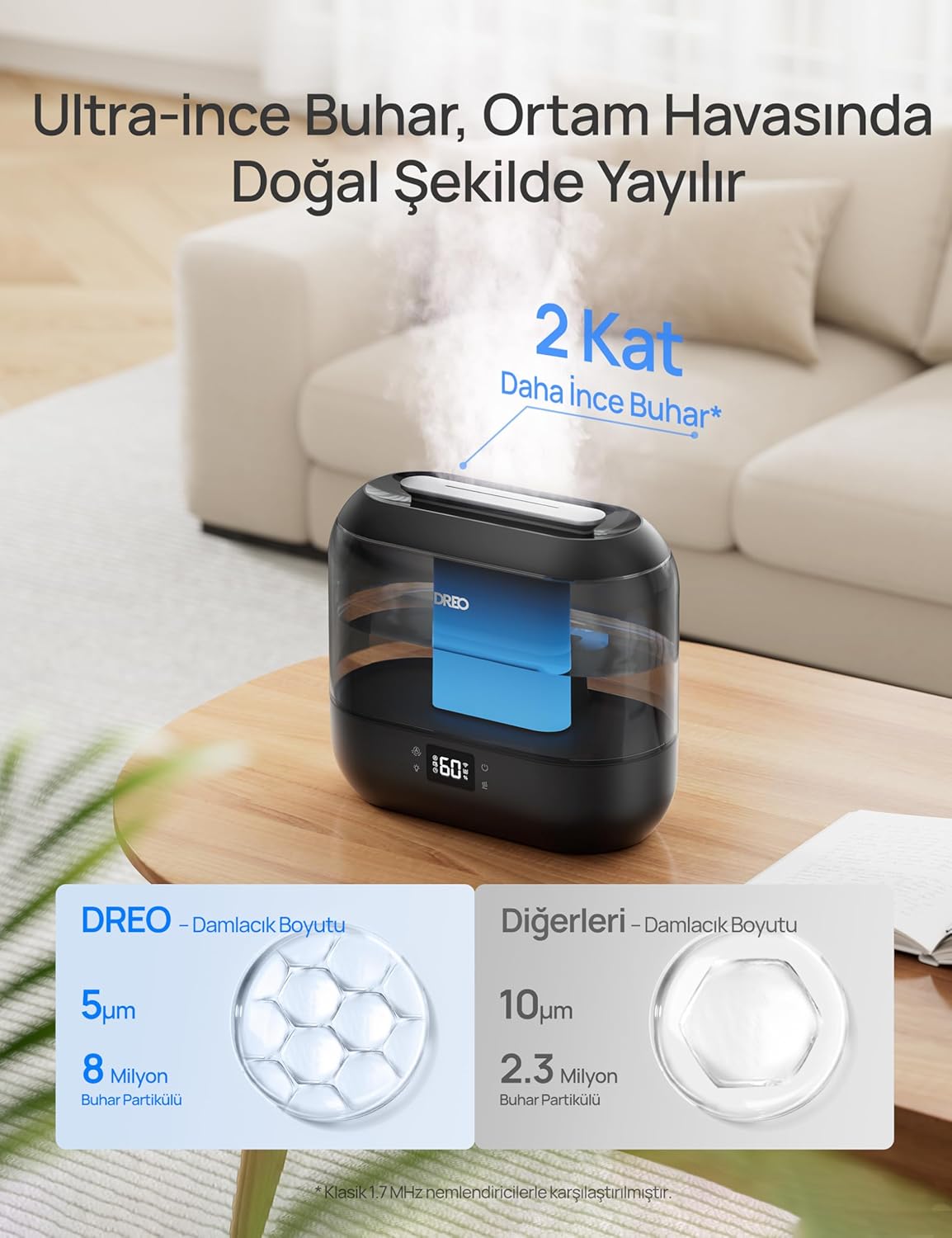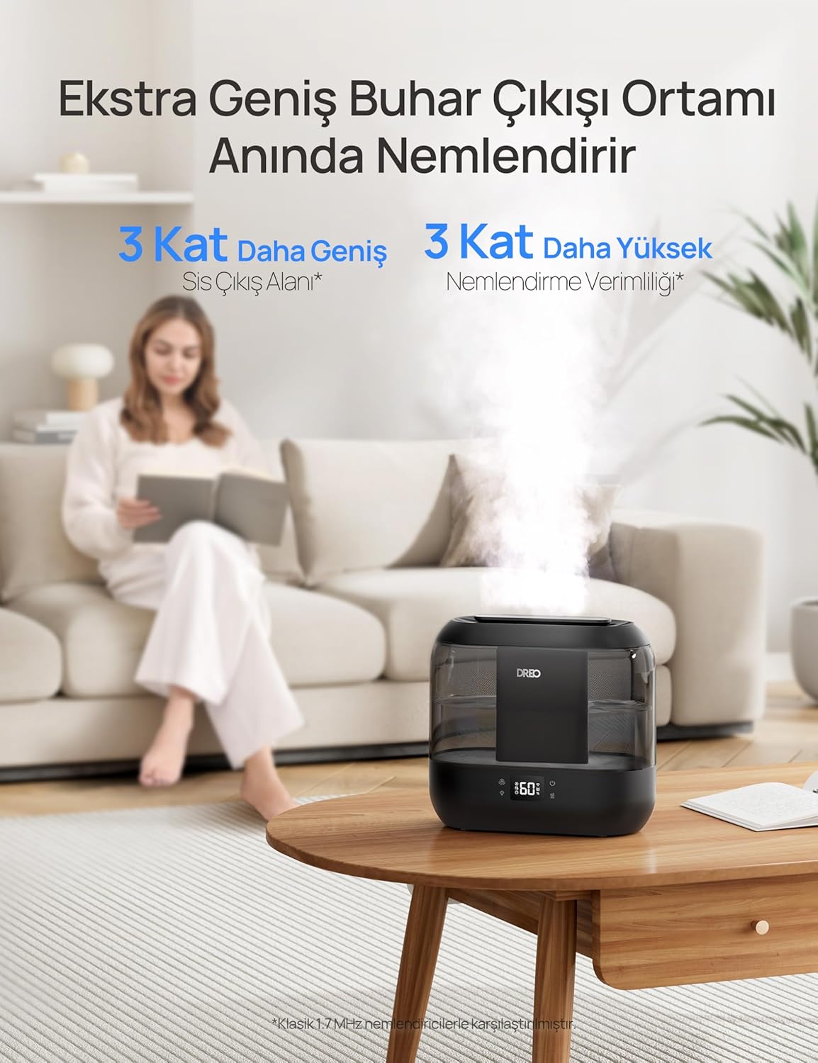 • ПО-ГОЛЯМА МЪГЛА, ПО-БЪРЗО ОБЛЕКЧЕНИЕ Благодарение на двойния непокътнат дизайн на Dreo, този овлажнител произвежда супер голяма мъгла, която е три пъти по-голяма от повечето други овлажнители, облекчавайки сухия въздух по-бързо и ви позволява да дишате по-лесно и по-здравословно.
