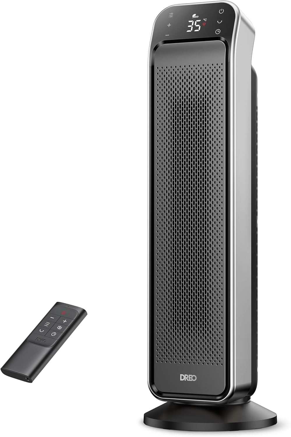 Dreo Solaris Max вентилаторен нагревател, енергоспестяващ, тих, 25-инчов керамичен нагревател с дистанционно управление и термостат, електрически нагревател 2000 W, 3 режима, 12-часов таймер, защита от прегряване и накланяне, Solaris Max