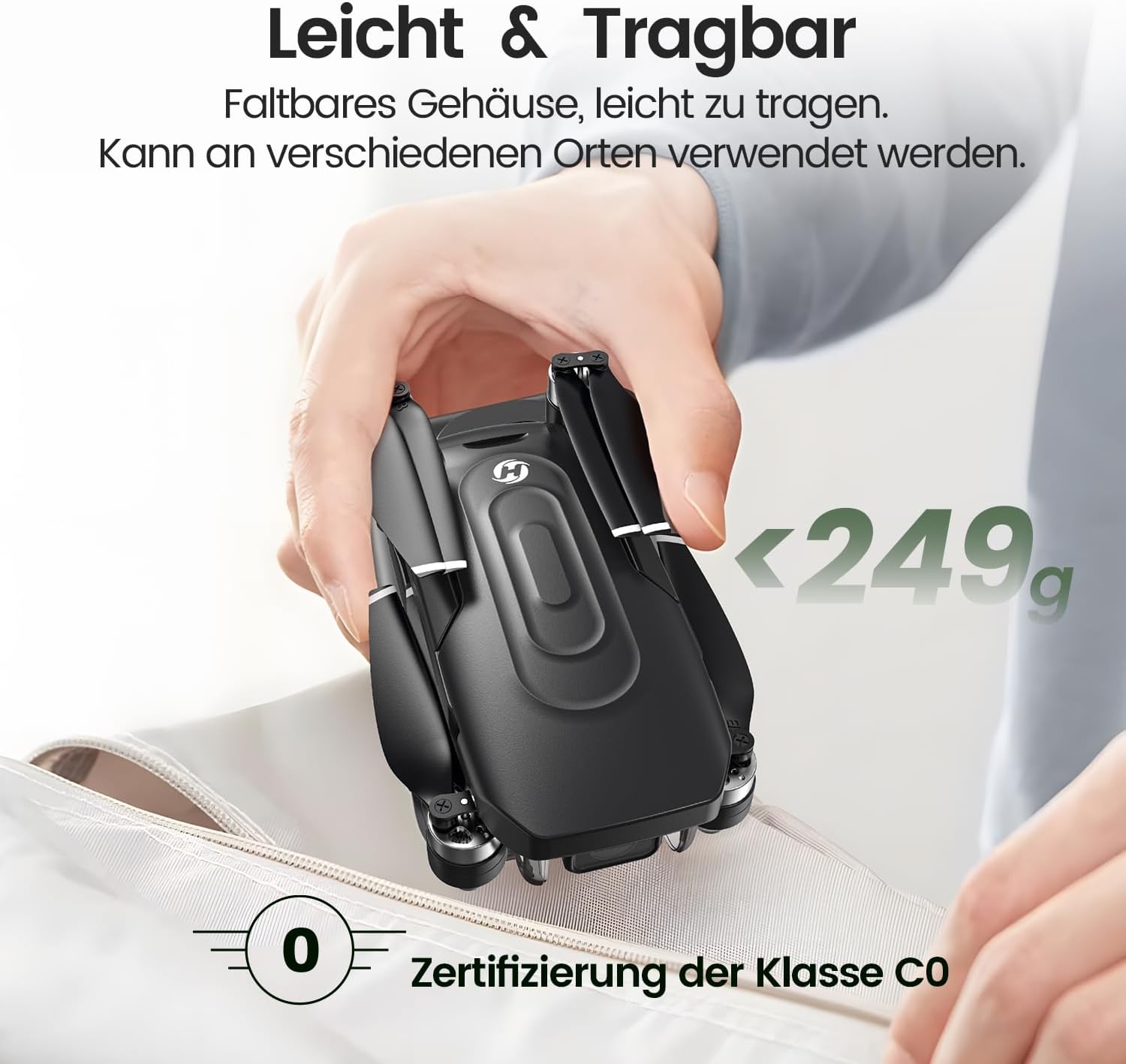 • С тегло под 249 грама и лек, сгъваем корпус, HS175G е перфектният спътник за приключения на открито. Сертифициран е като клас C0 съгласно регламента на ЕС. Моля, обърнете внимание, че поради вградената камера е необходима регистрация като пилот на дрон и може да се изисква застраховка за дрон по закон.