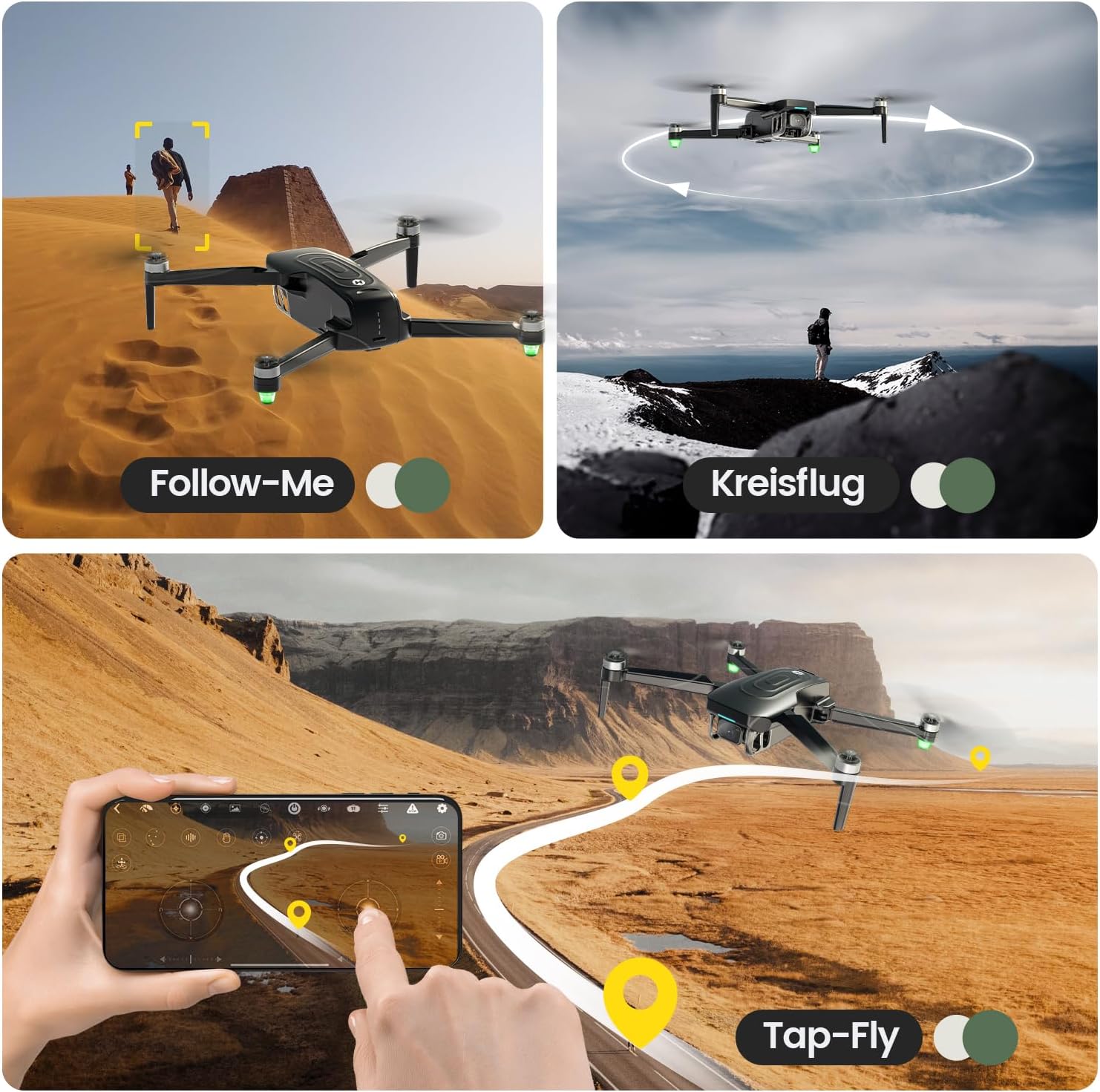 • Оптичен поток за стабилен полет: GPS + оптичният поток подобрява стабилността за по-рязко качество на изображението и плавни изображения и видеоклипове по време на стабилен полет. Това е полезно не само за начинаещи, но и за напреднали потребители на дронове.
