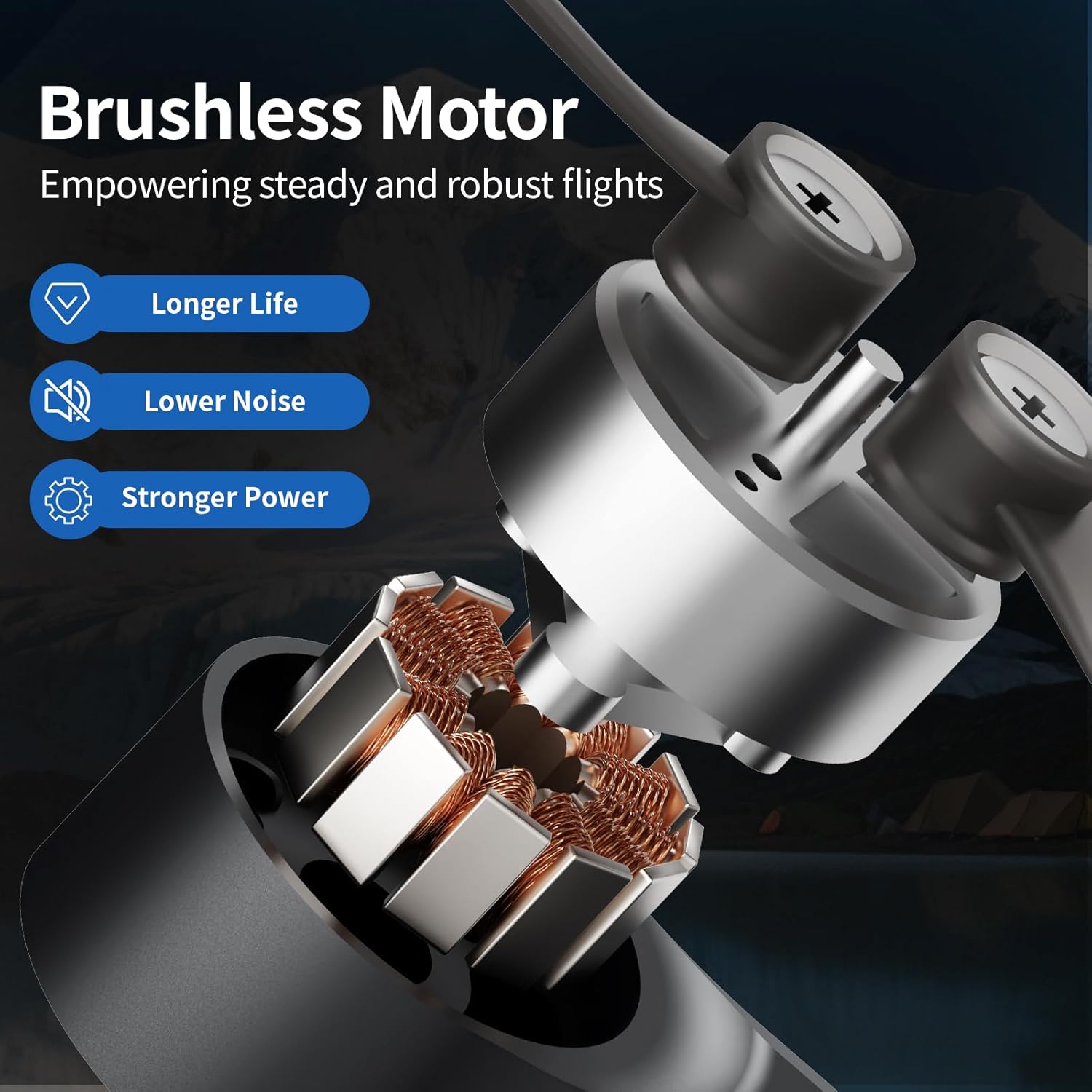 • ВИСОКОПРОДУКТИВЕН БЕЗЧЕТКОВ МОТОР Дронът за начинаещи е оборудван с мощни безчеткови двигатели, които осигуряват по-стабилно и по-тихо изживяване при полет. Те издържат на вятър и се адаптират към различни среди, което прави летенето по-комфортно. Максималната скорост на безчетковия двигател може да достигне 10 000 оборота в минута, което е по-ефективно от конвенционалните двигатели. В същото време те са по-издръжливи и имат по-дълъг експлоатационен живот, което намалява разходите за поддръжка.