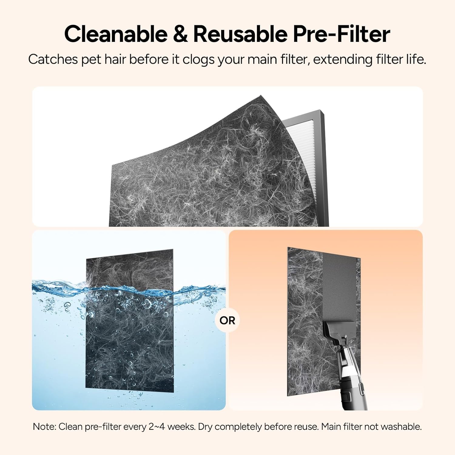 • Миещ се и многократно използваем предфилтър: почистващият се предфилтър улавя косми от домашни любимци и частици, преди да достигнат до основния филтър. Така системата работи безпроблемно и удължава експлоатационния живот. Намалява честотата на смяна на филтъра. Почиствайте предфилтъра на всеки 2-4 седмици, за да осигурите оптимална производителност и да се наслаждавате на по-чист и свеж въздух.