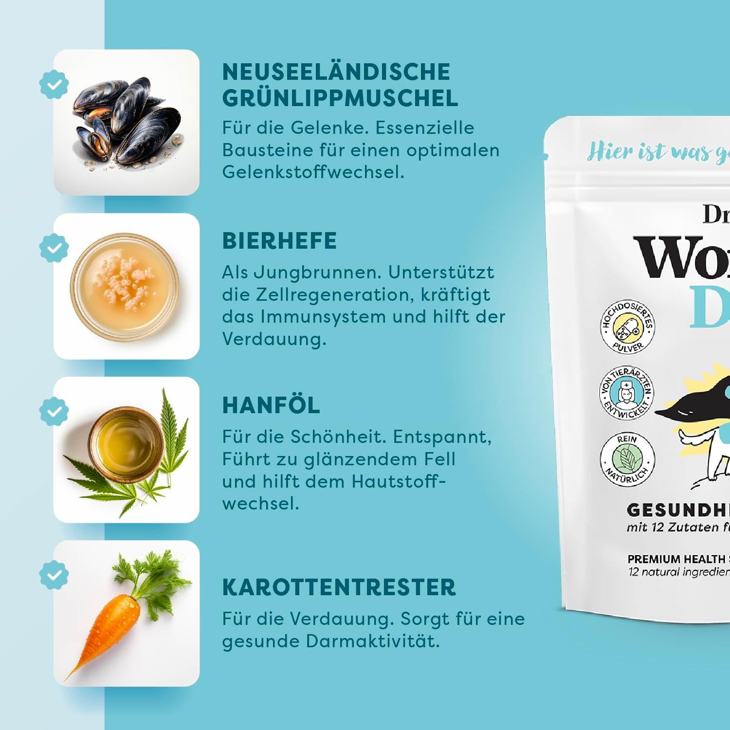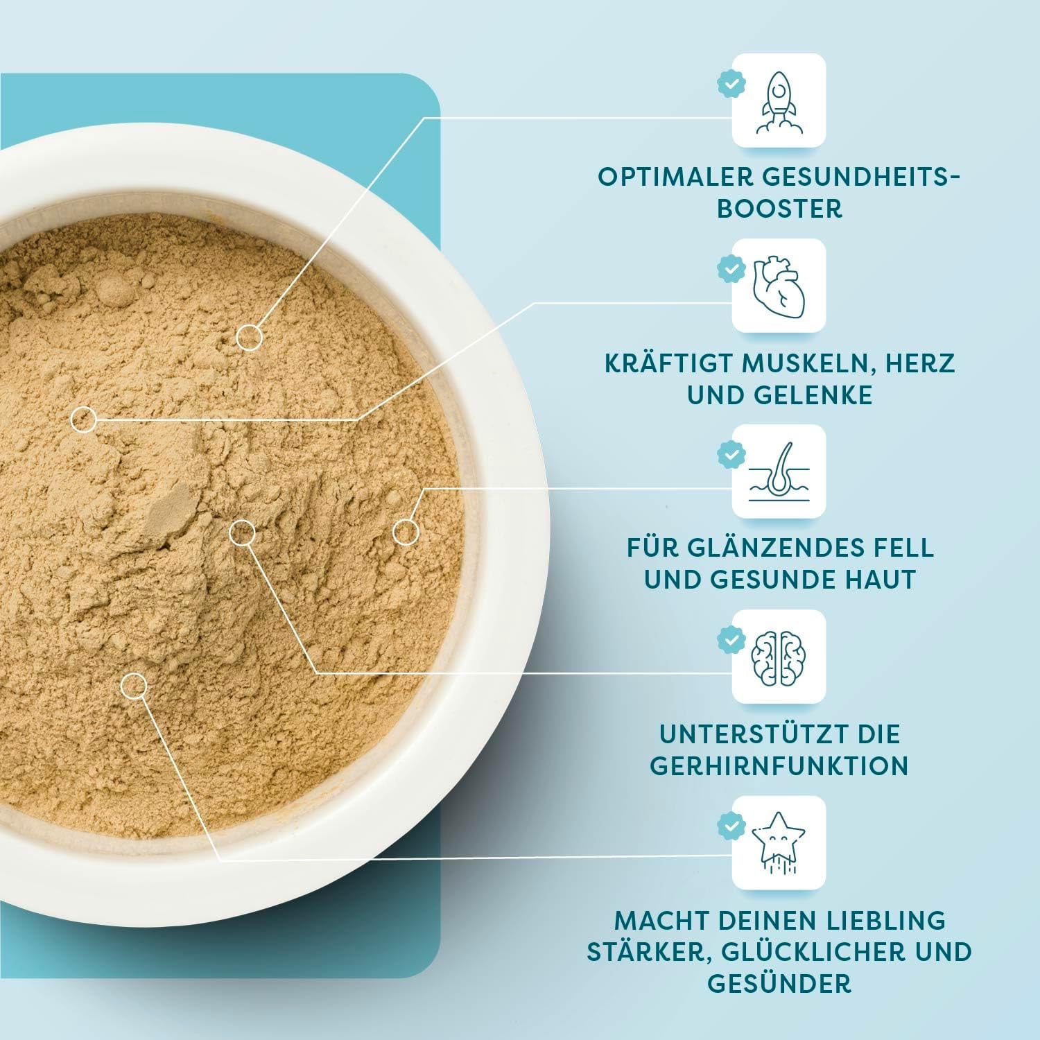 Мая (неактивна Saccharomyces cerevisiae); брашно от сушено месо от зеленоуста мида; цели семена от псилиум; смлени семена от бял трън; глюкозамин хидрохлорид; брашно от морски водорасли; смлян корен от дяволски нокът; конопено масло; метилсулфонилметан (MSM); хондроитин сулфат (свински); смлян корен от куркума; смлени цветове от лайка