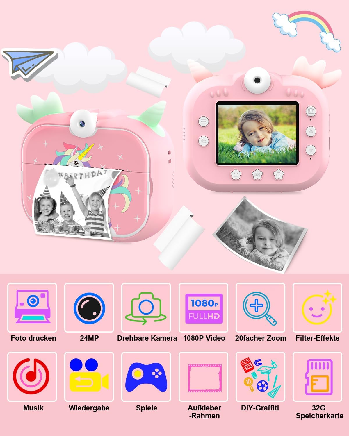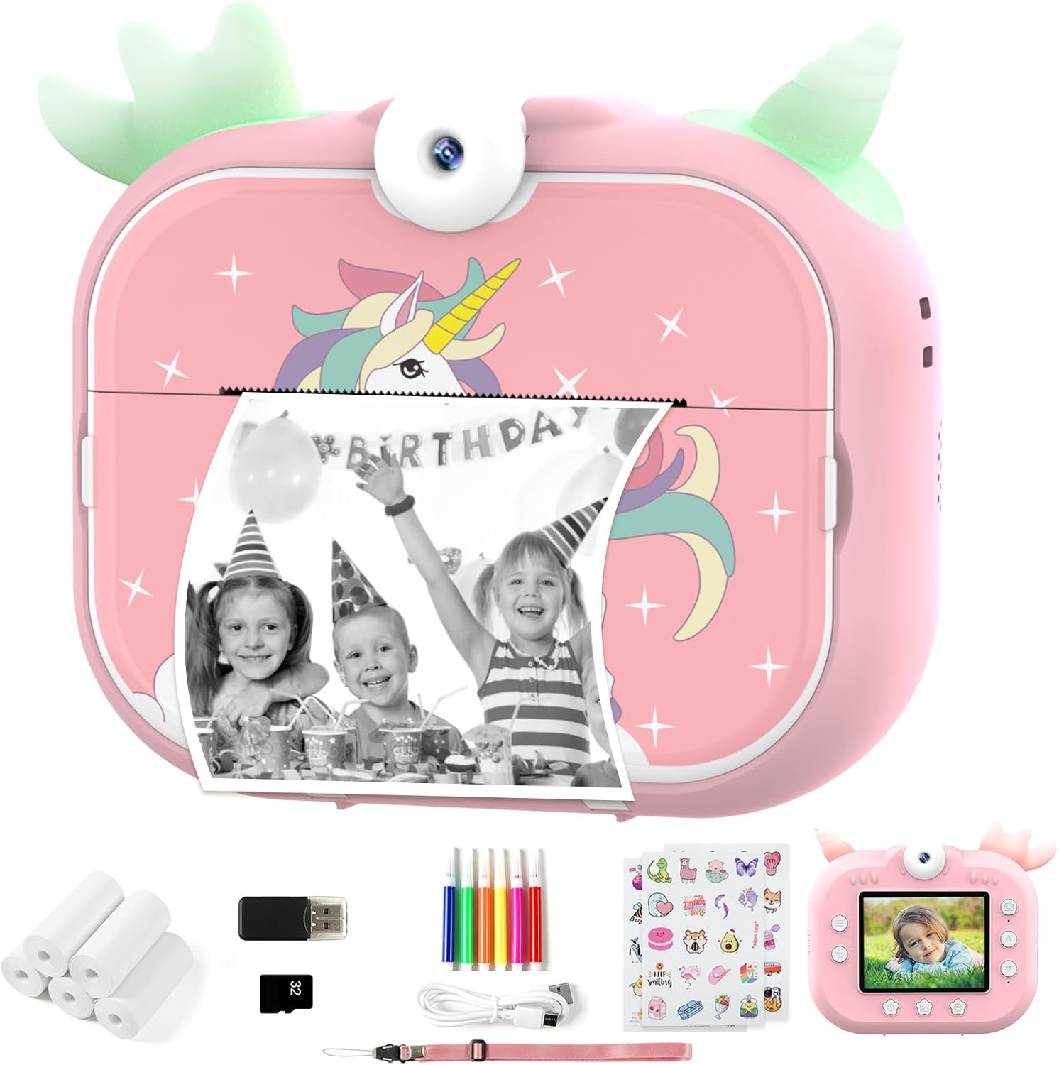 • Перфектен коледен подарък за деца: тези детски фотоапарати са изработени от безопасни материали, не съдържат PBA, имат сладък и издръжлив дизайн и лесна за разбиране повърхност. Това е перфектен коледен подарък за деца. Моля, обърнете внимание, че отпечатаните снимки са черно-бели. Съдържание на пакета: дигитален фотоапарат x1, 32GB micro SD карта x1, четец на карти x1, хартия за печат x5, цветни химикалки x5, въже против изгубване x1.