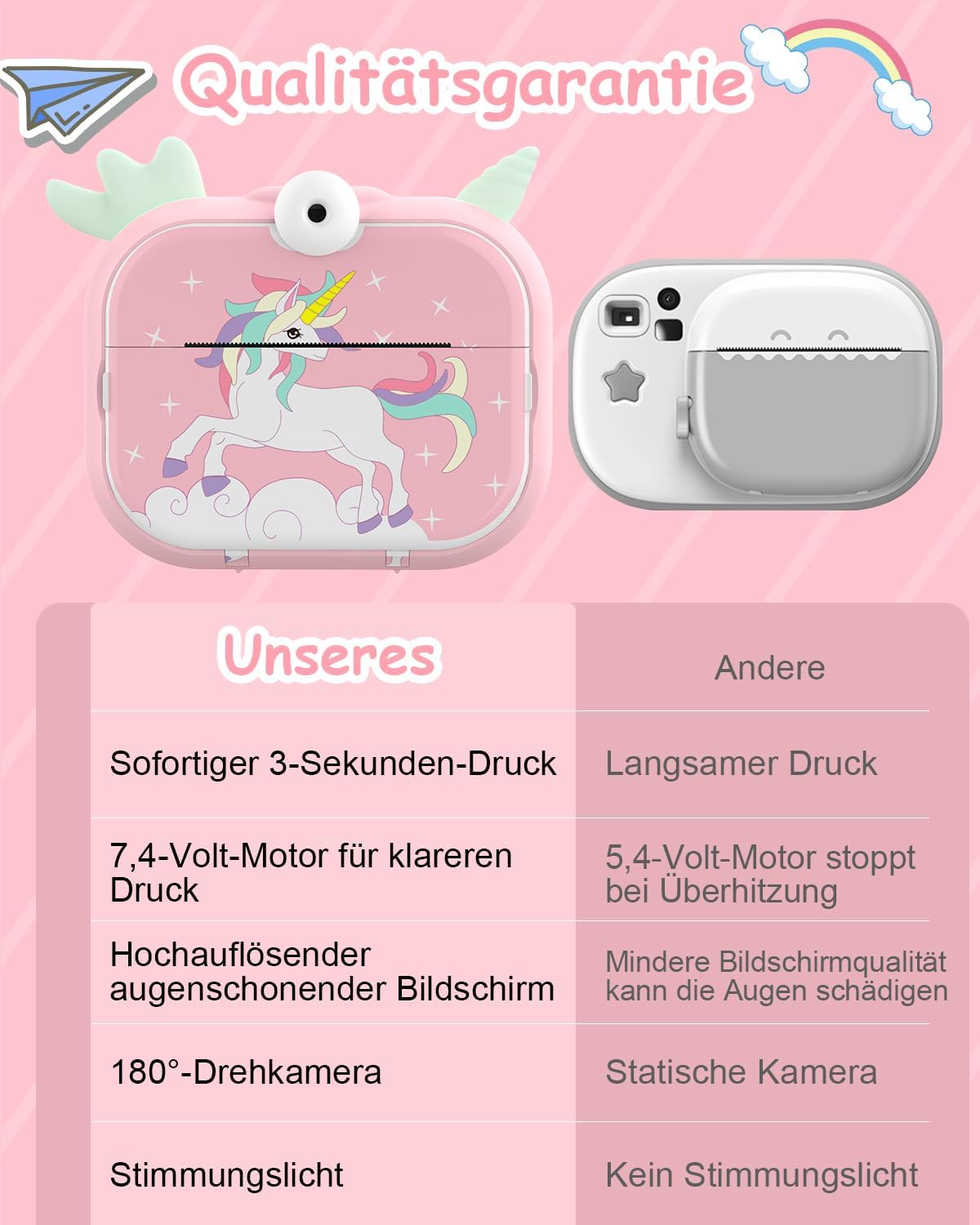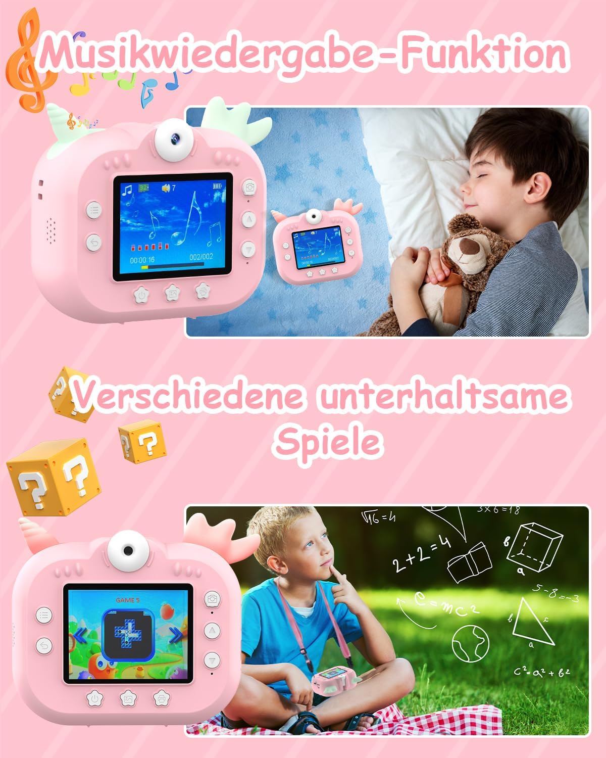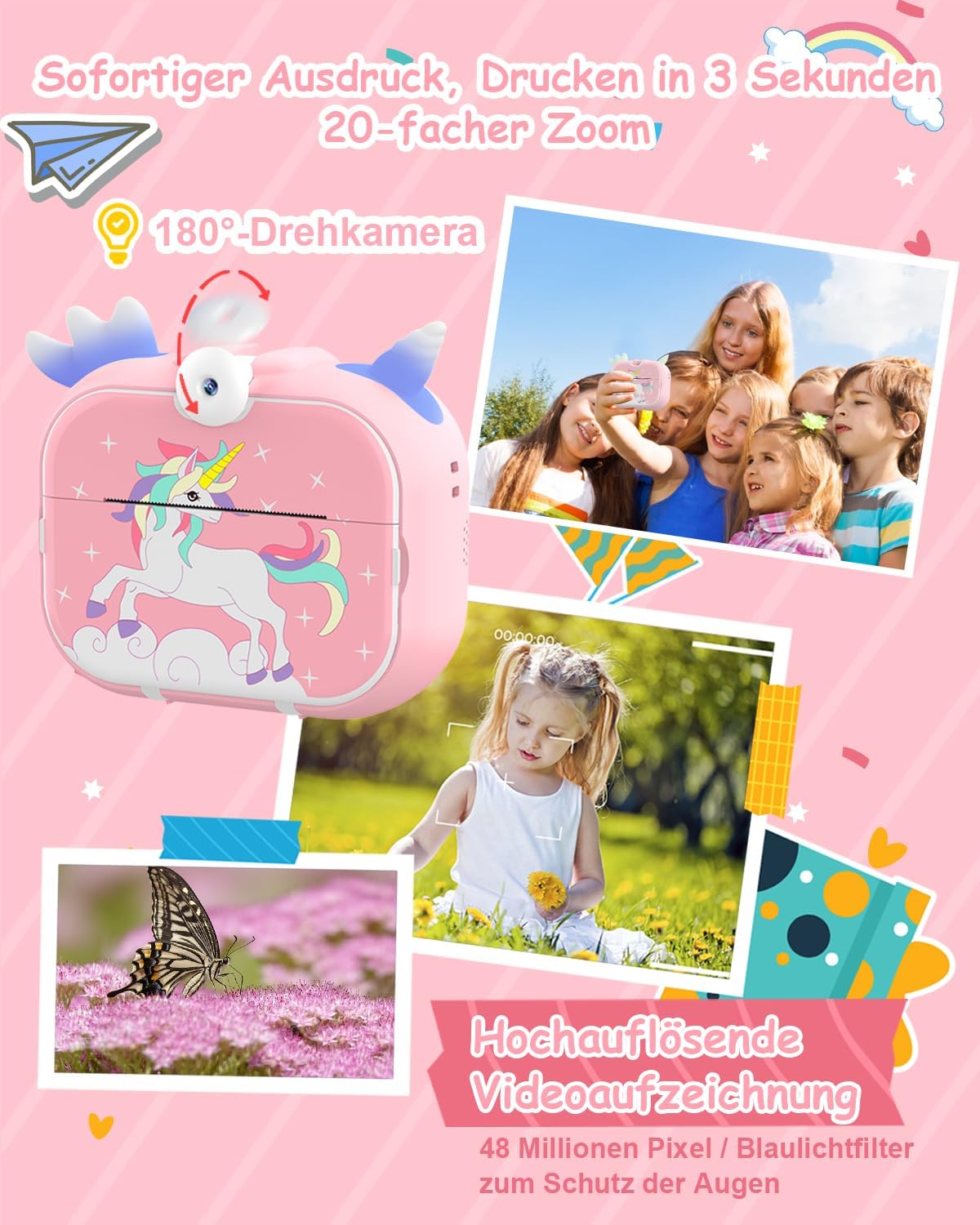• 4800 мегапиксела HD и защита на очите от синя светлина: детският дигитален фотоапарат има въртяща се на 180° камера за креативни снимки. Освен това, децата могат да записват видеоклипове с висока резолюция 1080P с камерата. Камерата предлага 20x увеличение и филтърни ефекти, както и защита на очите от синя светлина, за да предпази очите на децата. Съвет: ако налягането не е достатъчно ясно, моля, регулирайте плътността на налягането.