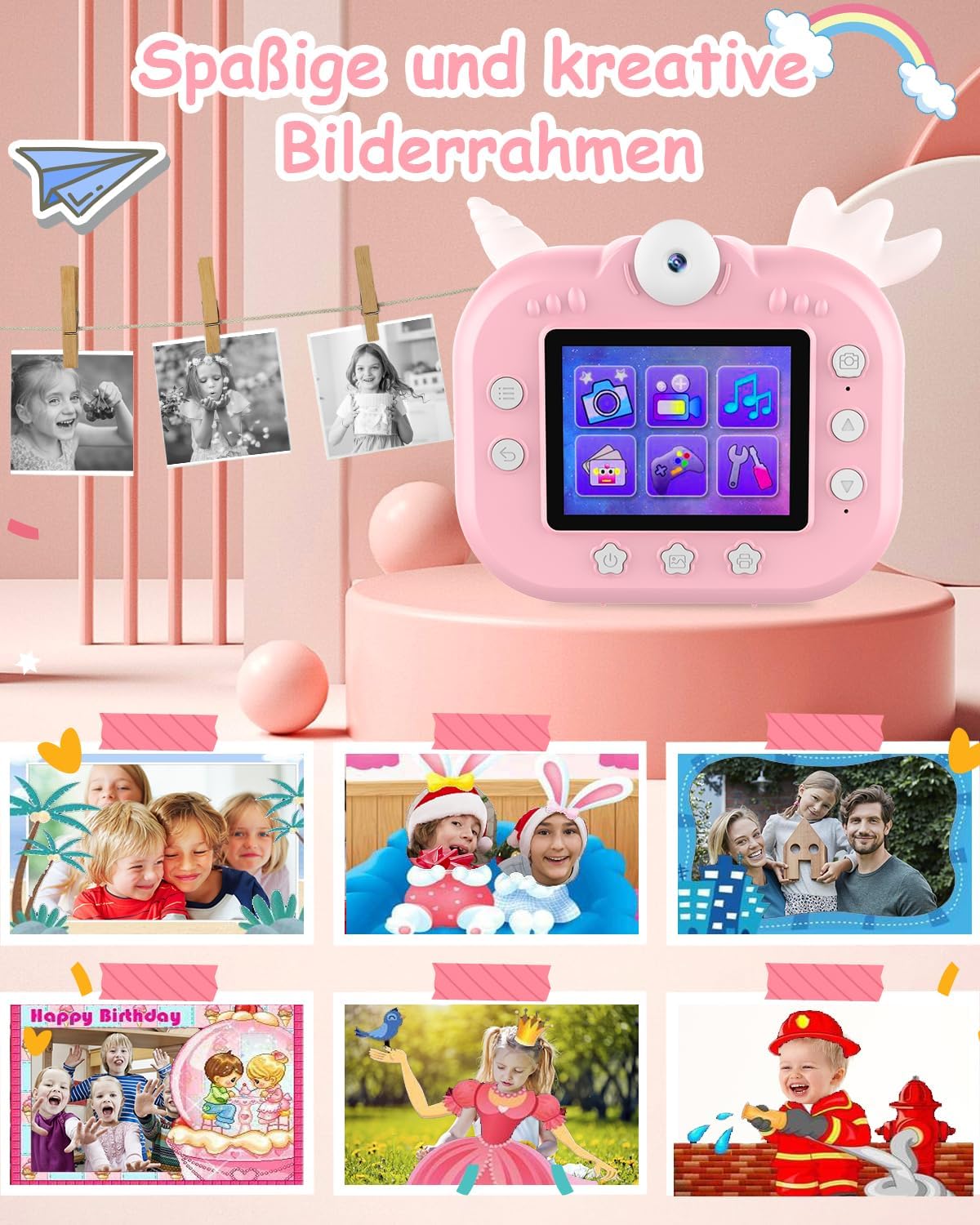 • Детска камера за моментално печатане: Детската камера Dufuso позволява на децата да отпечатват снимки веднага само за 3 секунди. 7,4-волтовият мотор поддържа непрекъснат печат. 2,4-инчовият IPS цветен дисплей има 4800 W пиксела и резолюция 1080P. Камерата предлага 7 интензитета на печат, 8 различни размера на снимките, 3 различни цветни светлини за настроение, 20x увеличение, 6 филтърни ефекта, 26 рамки за снимки и поддържа възпроизвеждане, запис с таймер и избор на 12 езика.