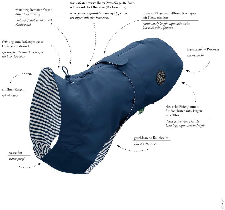 Allow Milford. Подобно е на класическата фризийска норка и е също толкова практично и функционално, колкото и "човешкият вариант". При дизайна на Milford са взети предвид специалните нужди на четириногите приятели. Ластичните ленти на задните крака осигуряват перфектно прилягане на лекото палто, дори при силни пориви на вятъра. Дъждобранът за кучета Milford се закопчава за нула време и индивидуално с широка велкро лента. Тя се закопчава отзад и може да се регулира бързо. В допълнение към отвора за D-образния пръстен на нашийника, палтото е идеално и за "носещи хамути" благодарение на водоустойчивия и индивидуално регулируем двупосочен цип. Грижата за палтото Milford е много проста: С мека, влажна кърпа всяка мръсотия може лесно да се избърше, освен ако дъждът вече не е поел по напълно естествен начин. Може да се пере на 30°C.