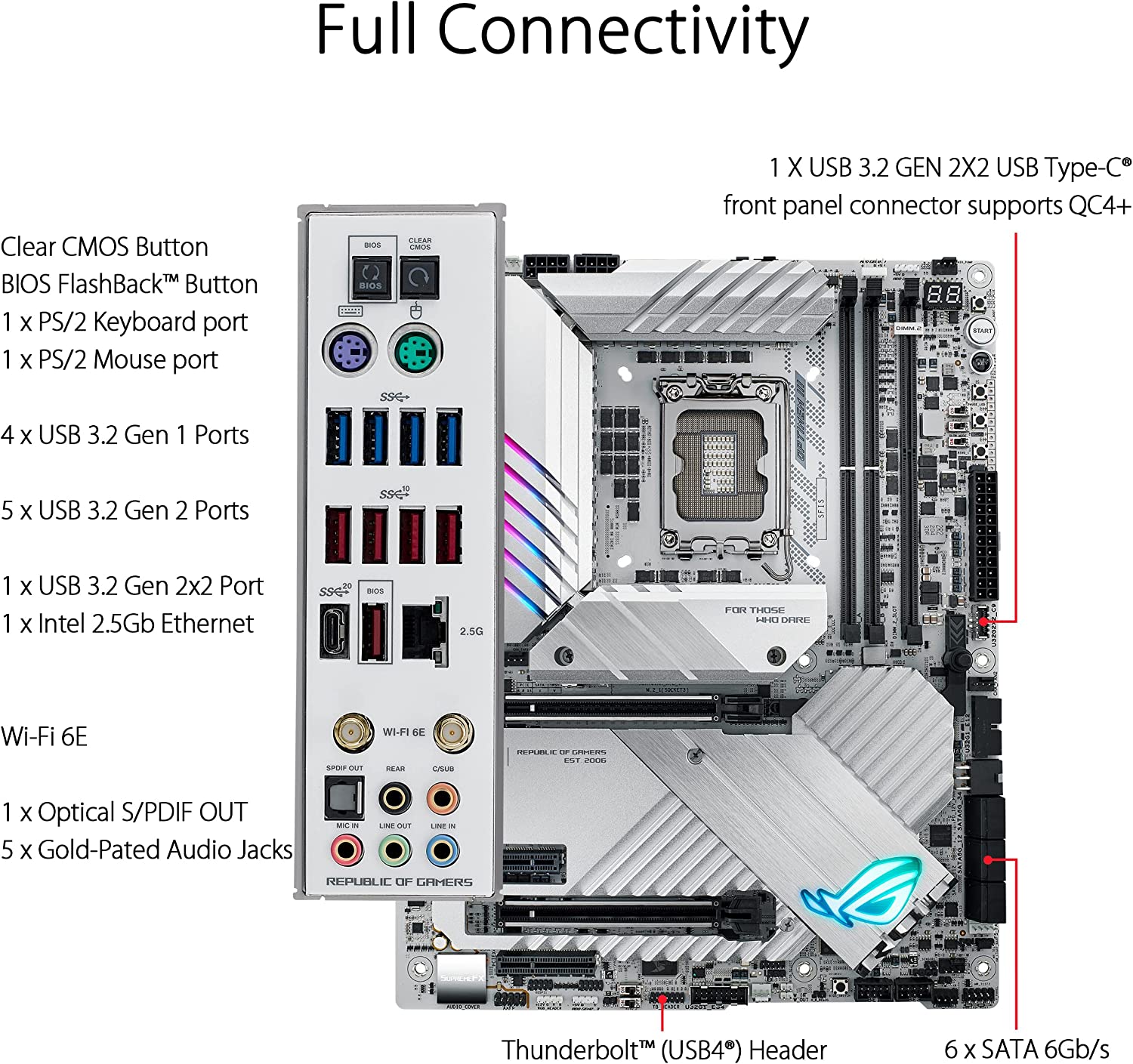 • Разнообразна свързаност: USB 3.2 Gen 2×2 Type-C порт отзад и допълнителен порт отпред с Quick Charge 4+ до 60 W, USB 3.2 Gen 2 и Gen 1 портове, PCIe 5.0 x16 SafeSlot