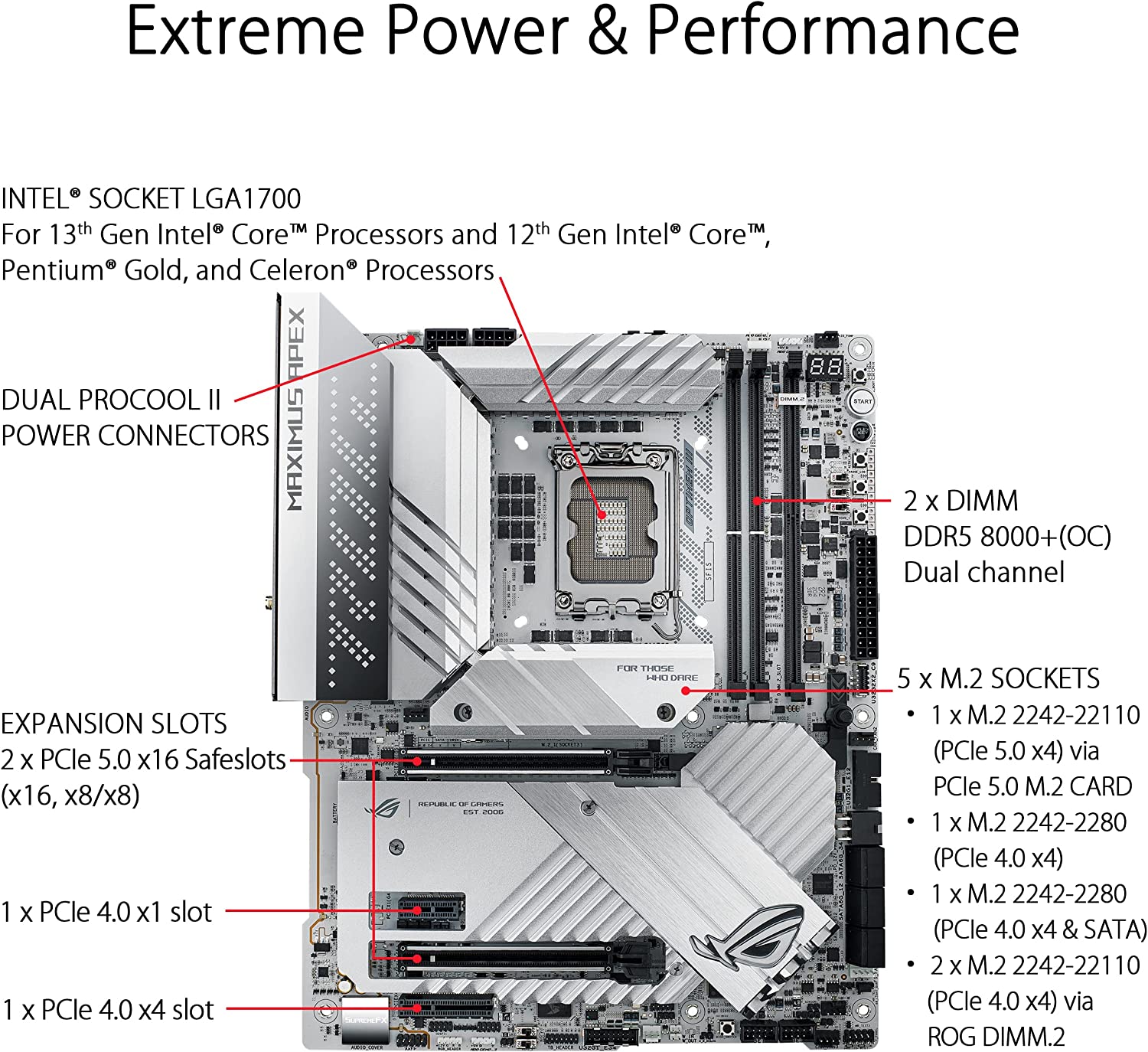 • Следващо поколение M.2 поддръжка: един PCIe 5.0 M.2 слот на една PCIe 5.0 M.2 разширителна карта, два PCIe 4.0 слота на една ROG DIMM.2 разширителна карта и два вградени PCIe 4.0 M.2 слота с радиатори