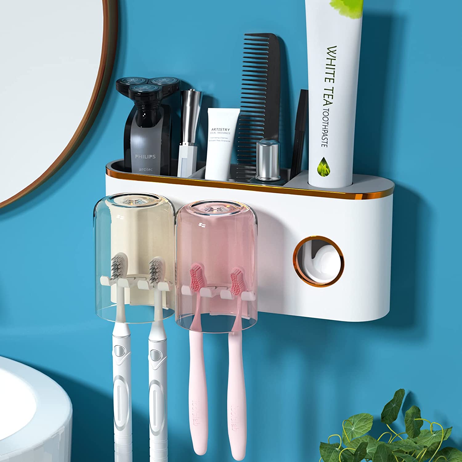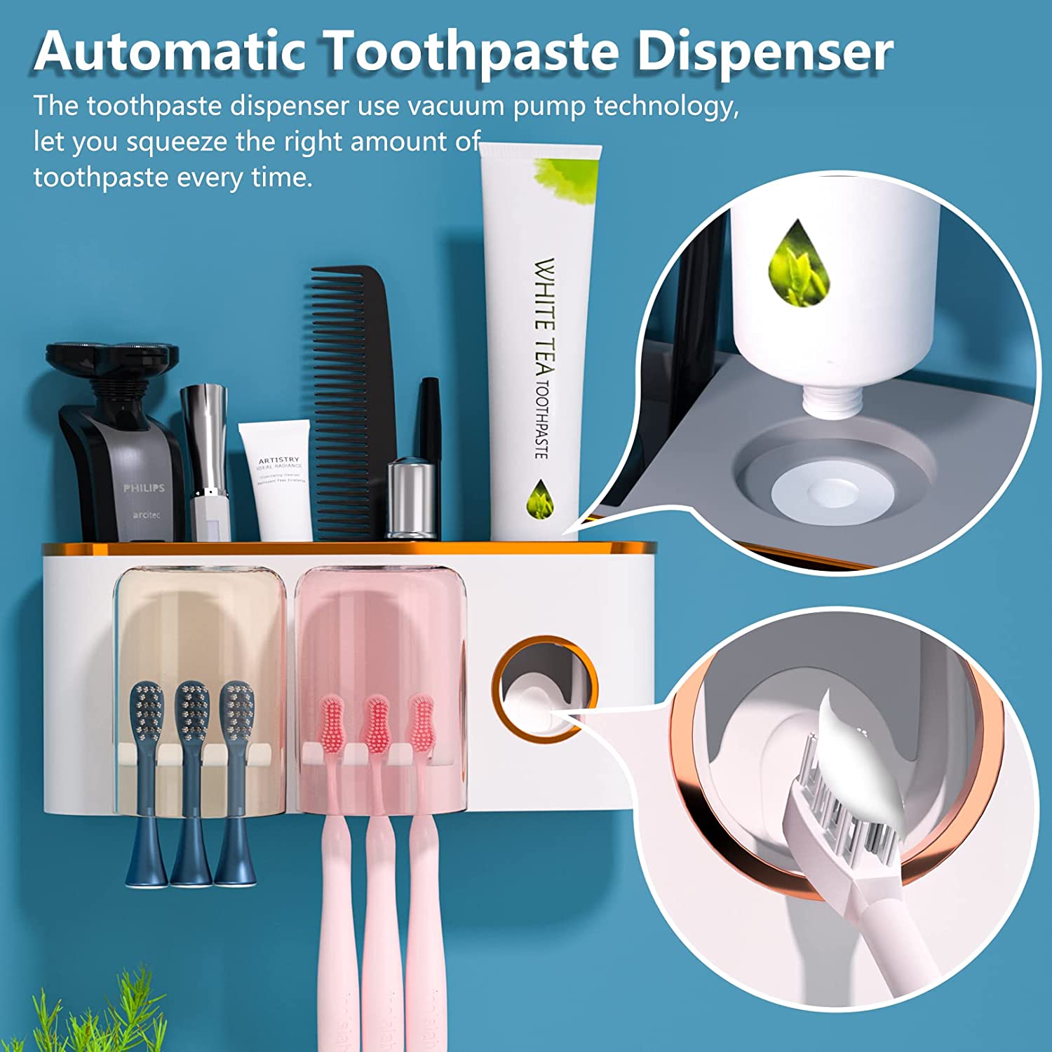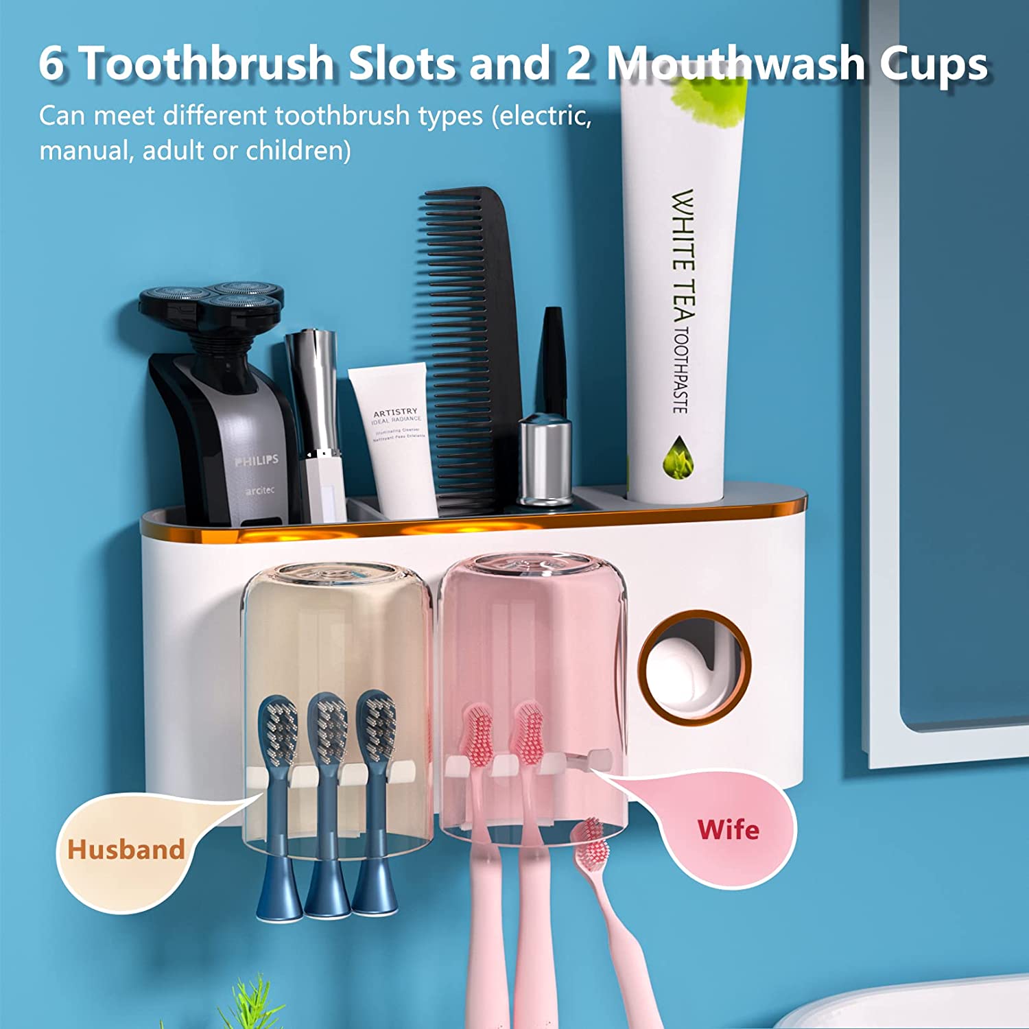 Държачи за четки за зъби DENSAIL, За стена, Автоматичен дозатор, 2 чаши, 6 слота за четки за зъби, 2 места за съхранение