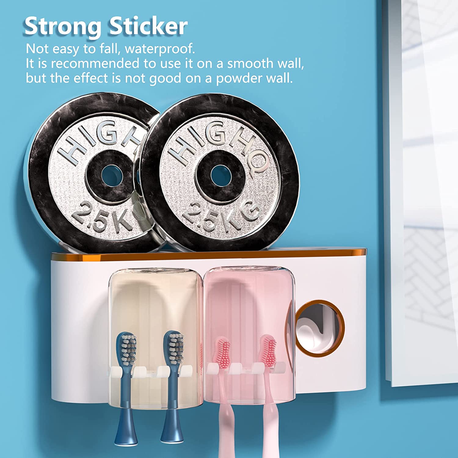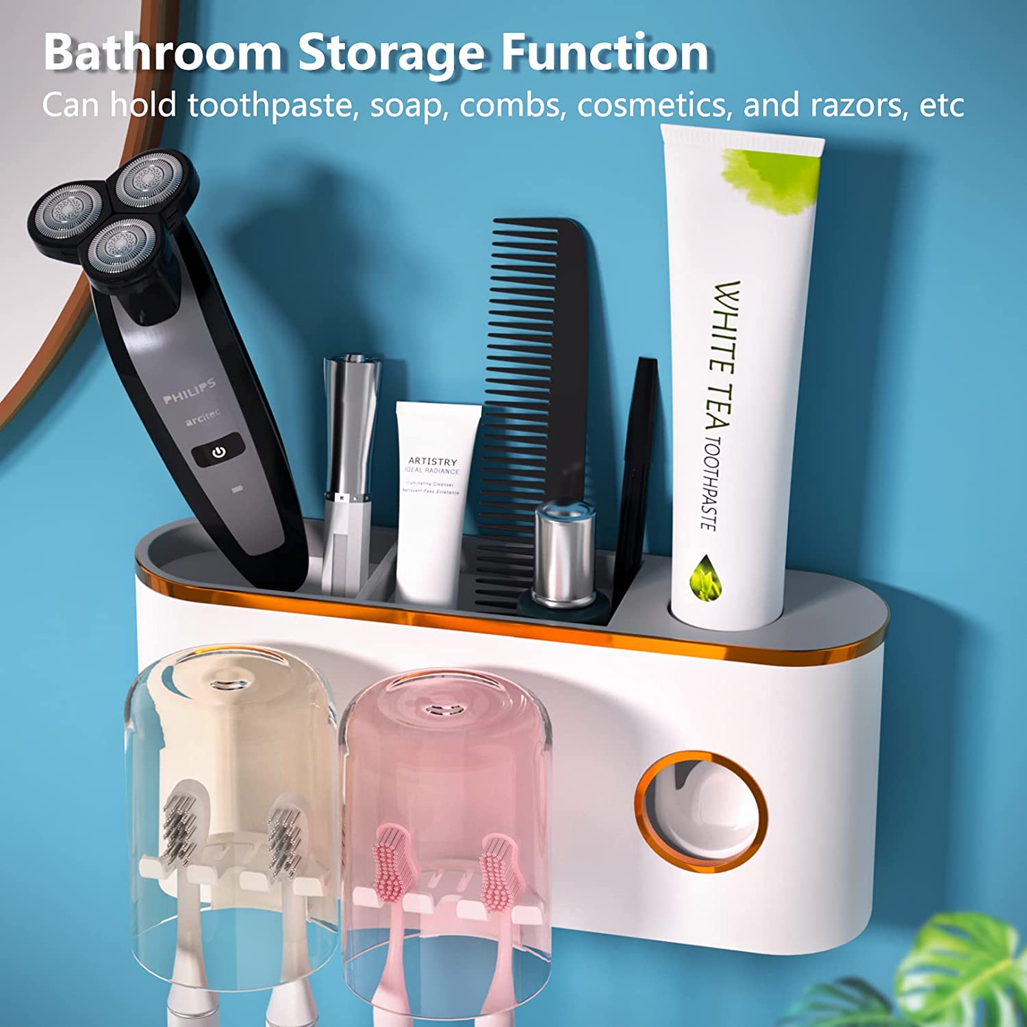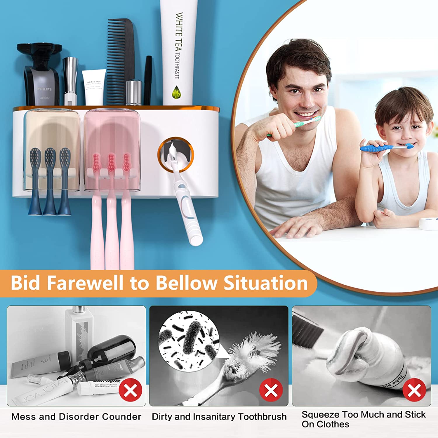 Държачи за четки за зъби DENSAIL, За стена, Автоматичен дозатор, 2 чаши, 6 слота за четки за зъби, 2 места за съхранение