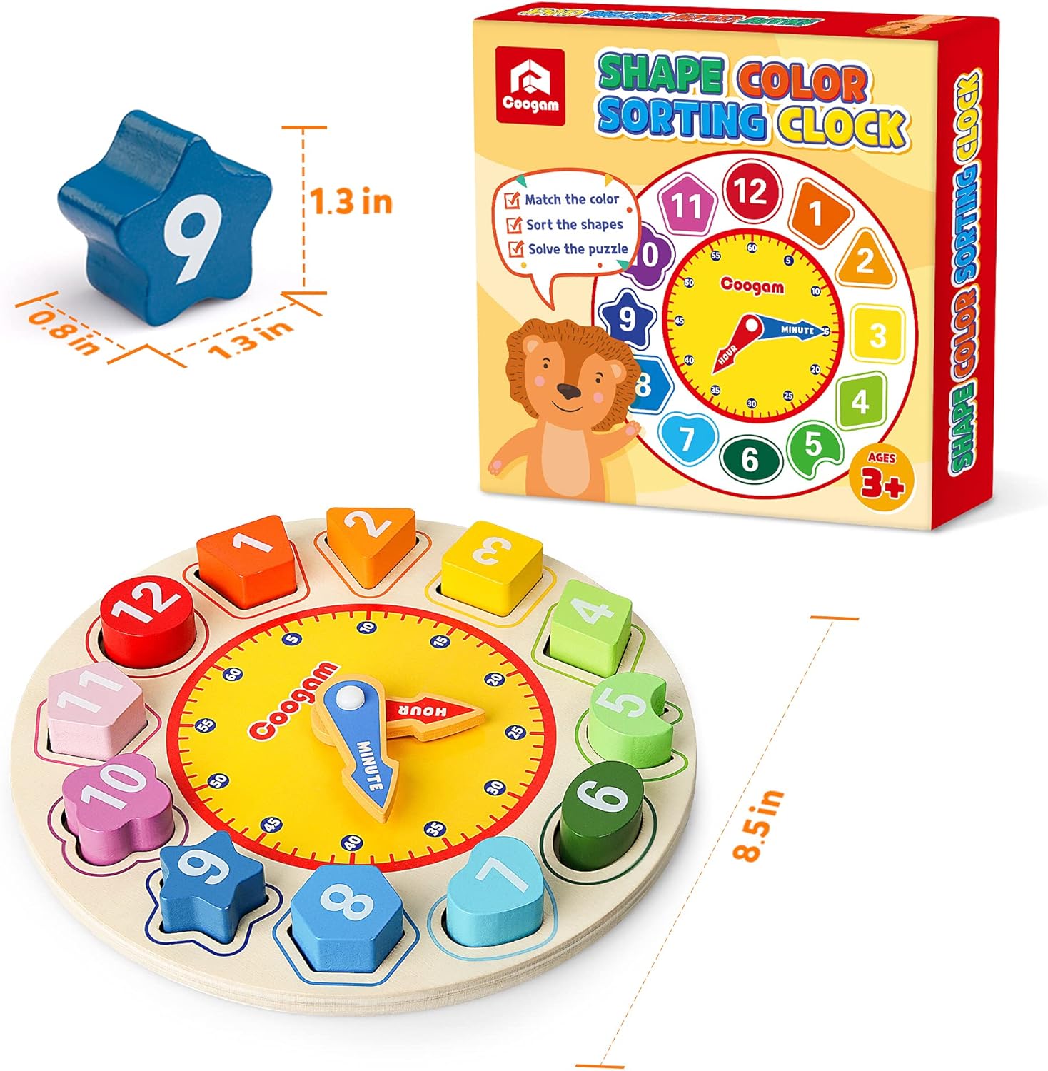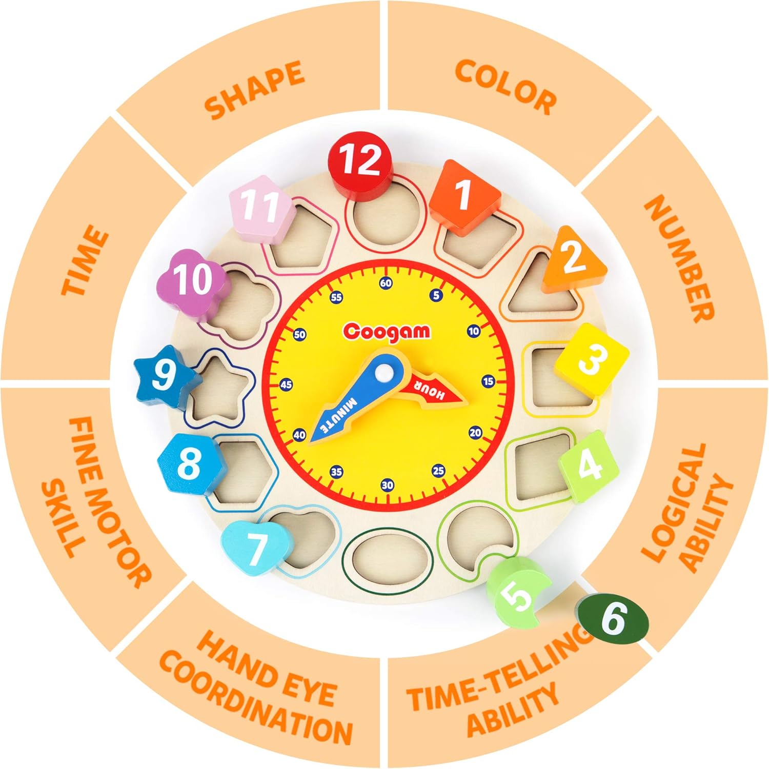 1. Entnehmen Sie die Lernuhr aus der Verpackung. 2. Nehmen Sie die 12 abnehmbaren Blöcke und die 12 geformten Ziffernblöcke heraus. 3. Platzieren Sie die geformten Ziffernblöcke auf dem Ziffernblatt entsprechend der Uhrzeit. 4. Bewegen Sie die Zeiger entsprechend der Uhrzeit. 5. Spielen Sie mit den Blöcken als Puzzle und arbeiten Sie an Form, Farbe und Anzahl. 6. Verwenden Sie die Lernuhr, um die Zeit ohne Digitaluhr zu erkennen.
