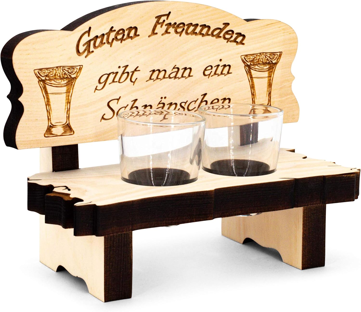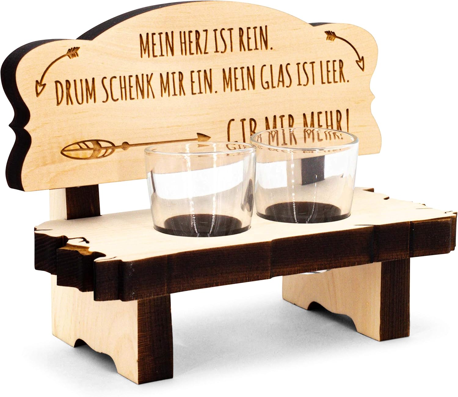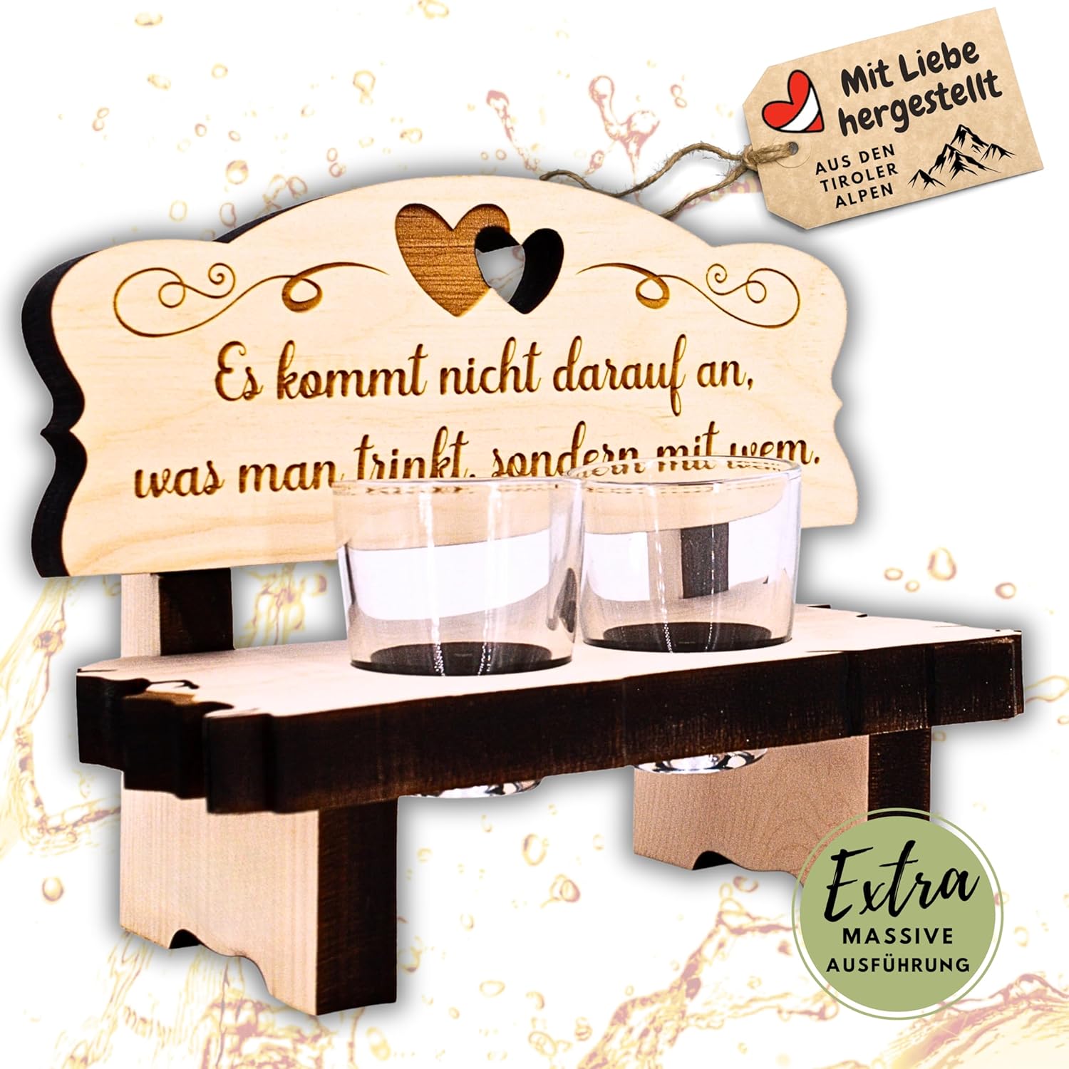 Дървена пейка за шнапс Sagl.tirol с гравиране [100% естествено] - Подаръци за г-н и г-жа, сватбени подаръци за булка и младоженец с 2 чаши за шнапс