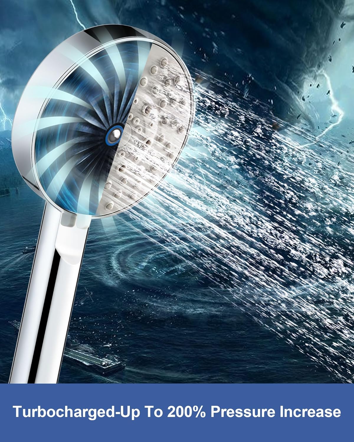 • Душ глава с високо налягане: Тази мощна душ глава използва усъвършенствана турбо технология, която може ефективно да подобри водното налягане. Тази душ глава с високо налягане е подходяща за ниско водно налягане. Важна забележка: В душовата глава има турбина за усилване на налягането, което може да издава тракащ шум вътре, но е нормално за този артикул.