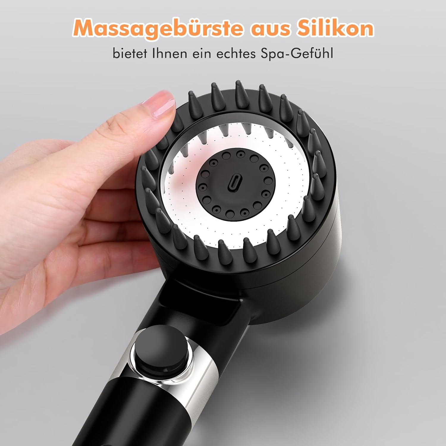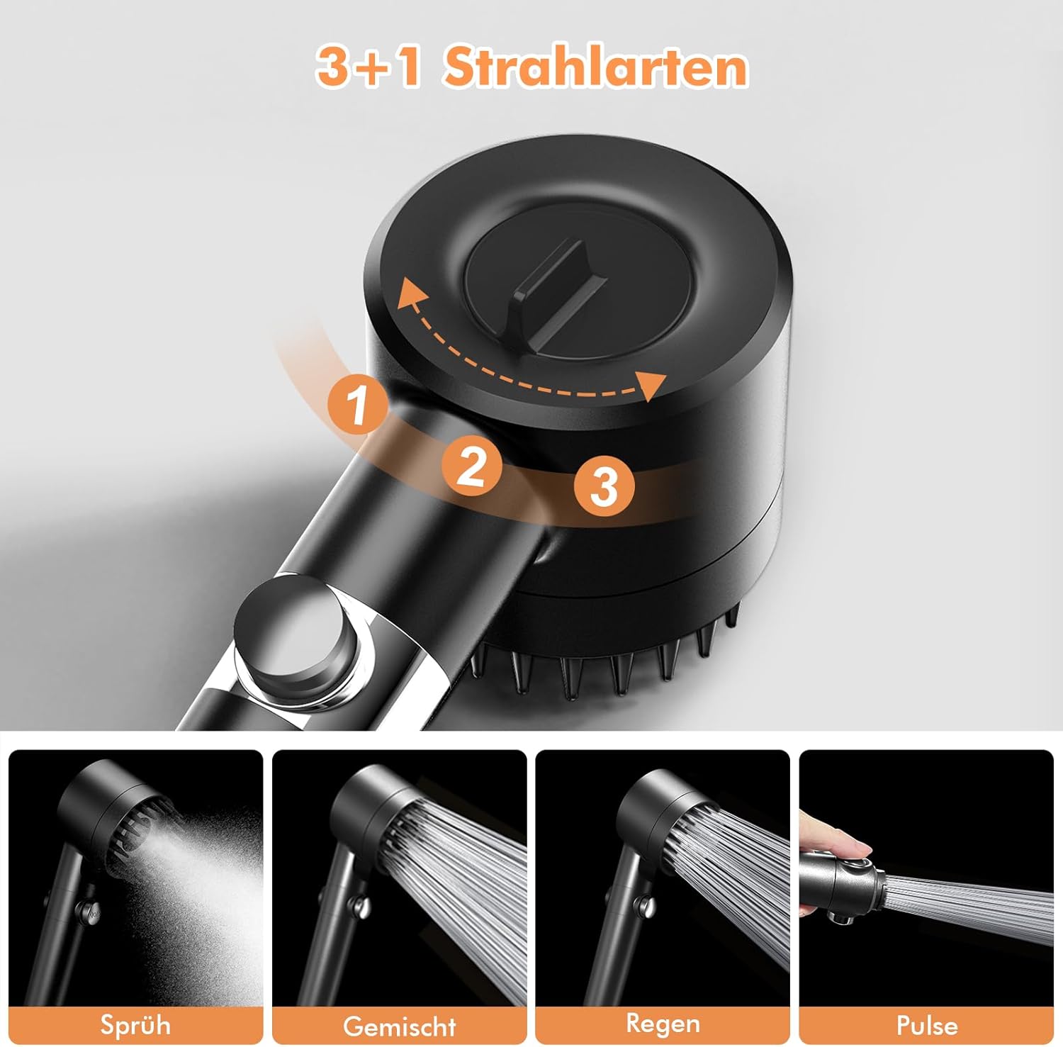 • 3+1 режима на струя и силиконов масаж: предлага 4 варианта на струя: дъжд, спрей, смесена и силна пулсация - могат да се сменят с натискане на бутон. Режимът на нежна струя облекчава мускулното напрежение, докато пулсацията е идеална за почистване.
