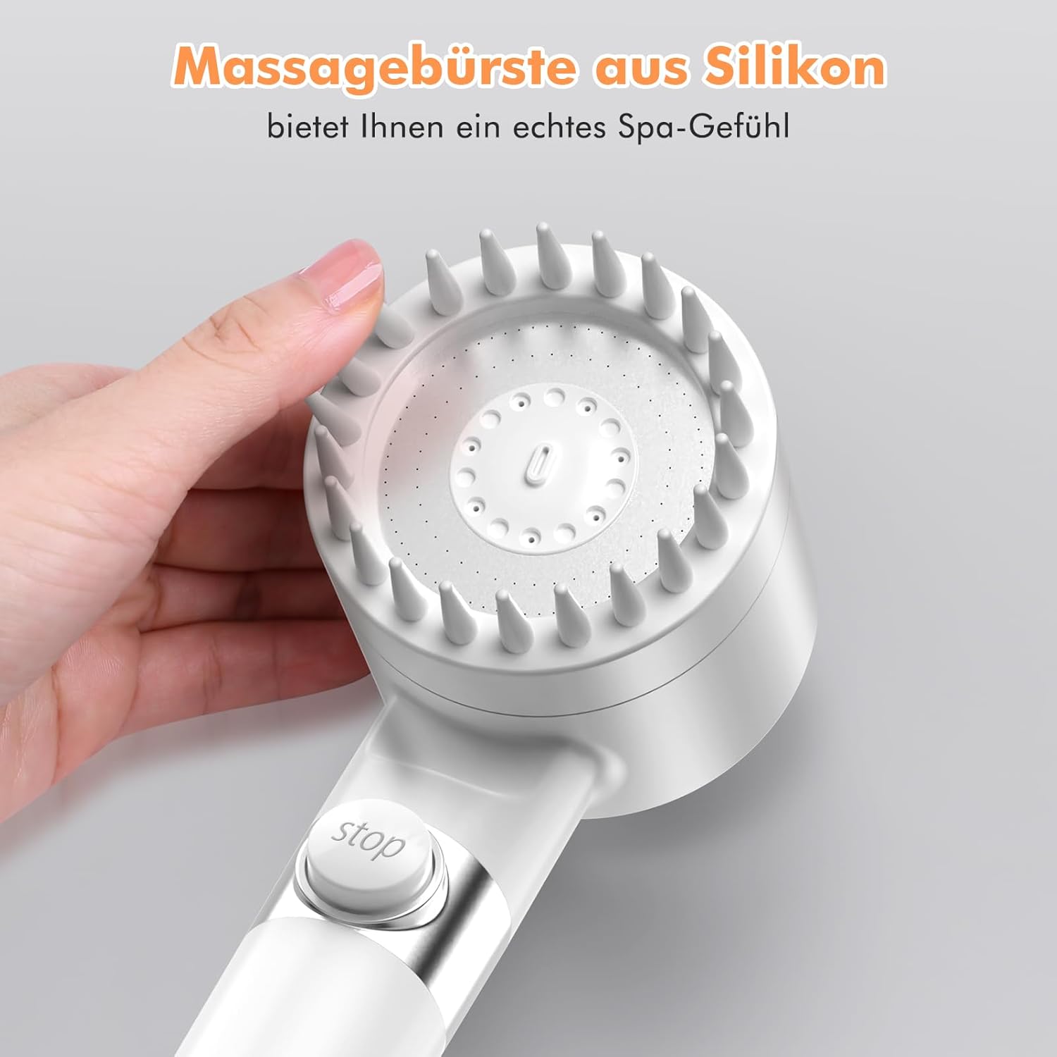 • 3+1 режима на струя и силиконов масаж: предлага 4 варианта на струя: дъжд, спрей, смесена и силна пулсация - могат да се сменят с натискане на бутон. Режимът на нежна струя облекчава мускулното напрежение, докато пулсацията е идеална за почистване.