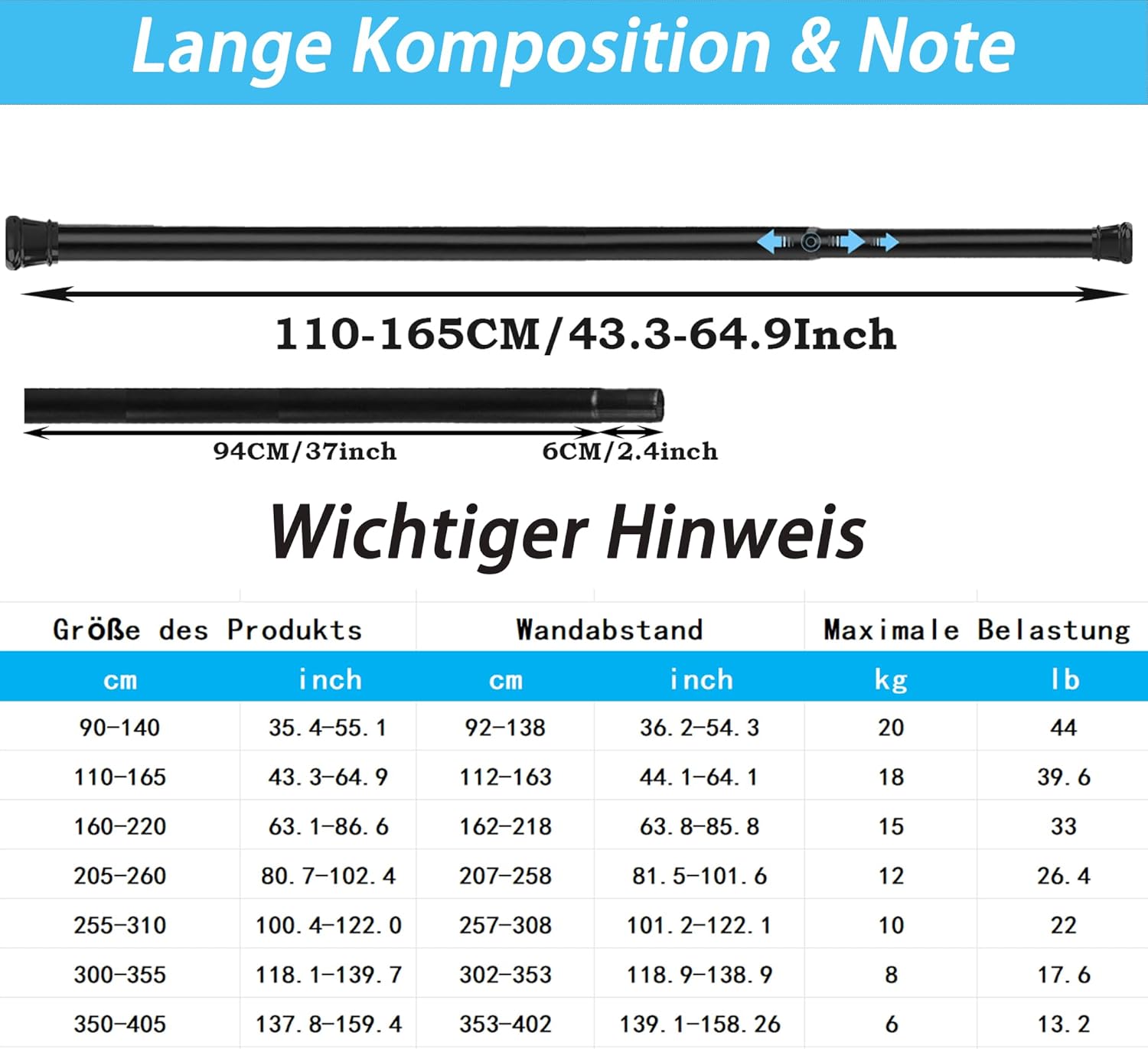 • Съдържание на опаковката и бележка: 1 x телескопичен прът 40-63 см, 2 x удължителен прът 35 см и 1 x допълнителен удължителен прът 25 см. Корниз за завеси без пробиване, моля, уверете се, че сте го монтирали в лявата фотогалерия след втората снимка и видеото за монтаж.